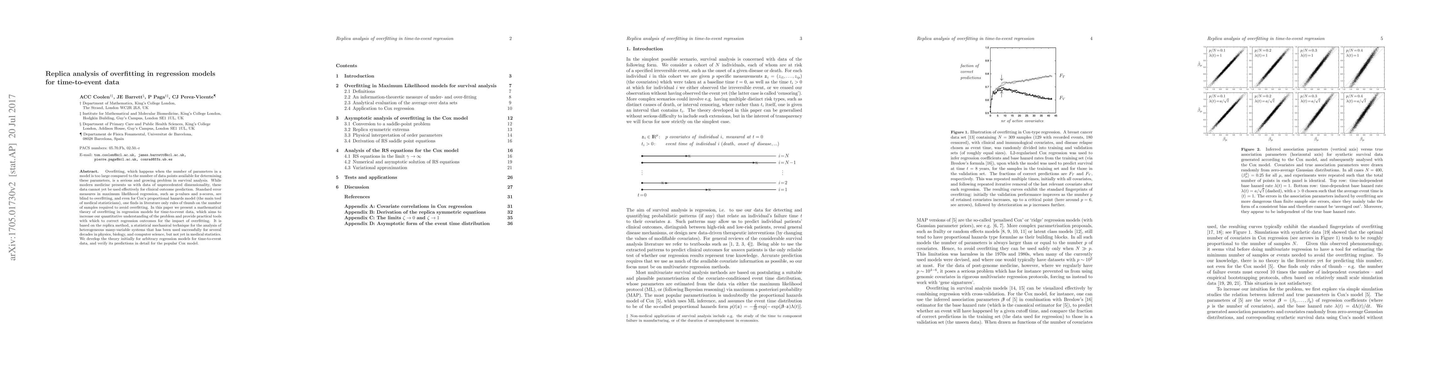 Overfitting, which happens when the number of parameters in a model is too large compared to the number of data points available for determining these parameters, is a serious and growing problem in survival analysis. While modern medicine presents us with data of unprecedented dimensionality, these data cannot yet be used effectively for clinical outcome prediction. Standard error measures in maximum likelihood regression, such as p-values and z-scores, are blind to overfitting, and even for Cox's proportional hazards model (the main tool of medical statisticians), one finds in literature only rules of thumb on the number of samples required to avoid overfitting. In this paper we present a mathematical theory of overfitting in regression models for time-to-event data, which aims to increase our quantitative understanding of the problem and provide practical tools with which to correct regression outcomes for the impact of overfitting. It is based on the replica method, a statistical mechanical technique for the analysis of heterogeneous many-variable systems that has been used successfully for several decades in physics, biology, and computer science, but not yet in medical statistics. We develop the theory initially for arbitrary regression models for time-to-event data, and verify its predictions in detail for the popular Cox model.