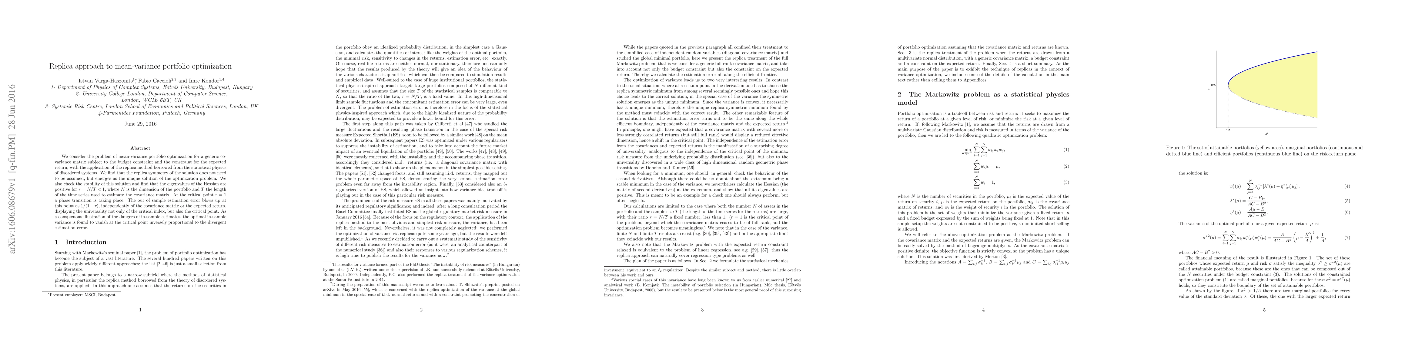 We consider the problem of mean-variance portfolio optimization for a generic covariance matrix subject to the budget constraint and the constraint for the expected return, with the application of the replica method borrowed from the statistical physics of disordered systems. We find that the replica symmetry of the solution does not need to be assumed, but emerges as the unique solution of the optimization problem. We also check the stability of this solution and find that the eigenvalues of the Hessian are positive for $r=N/T<1$, where $N$ is the dimension of the portfolio and $T$ the length of the time series used to estimate the covariance matrix. At the critical point $r=1$ a phase transition is taking place. The out of sample estimation error blows up at this point as $1/(1-r)$, independently of the covariance matrix or the expected return, displaying the universality not only of the critical index, but also the critical point. As a conspicuous illustration of the dangers of in-sample estimates, the optimal in-sample variance is found to vanish at the critical point inversely proportional to the divergent estimation error.
