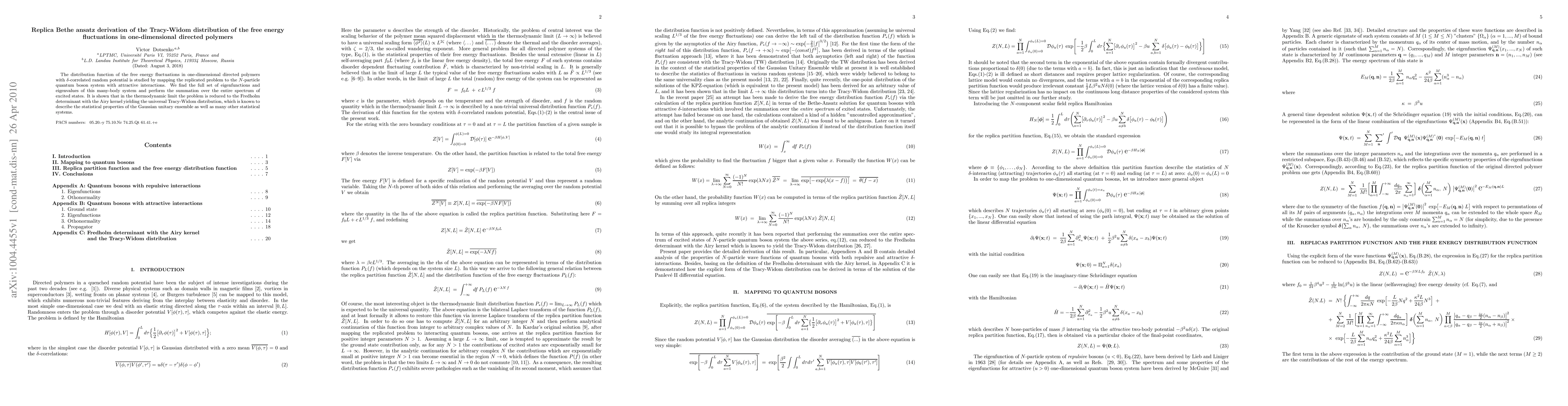 Researchers derived the Tracy-Widom distribution of free energy fluctuations in one-dimensional directed polymers using a replica Bethe ansatz approach. This distribution is known to describe various statistical systems.