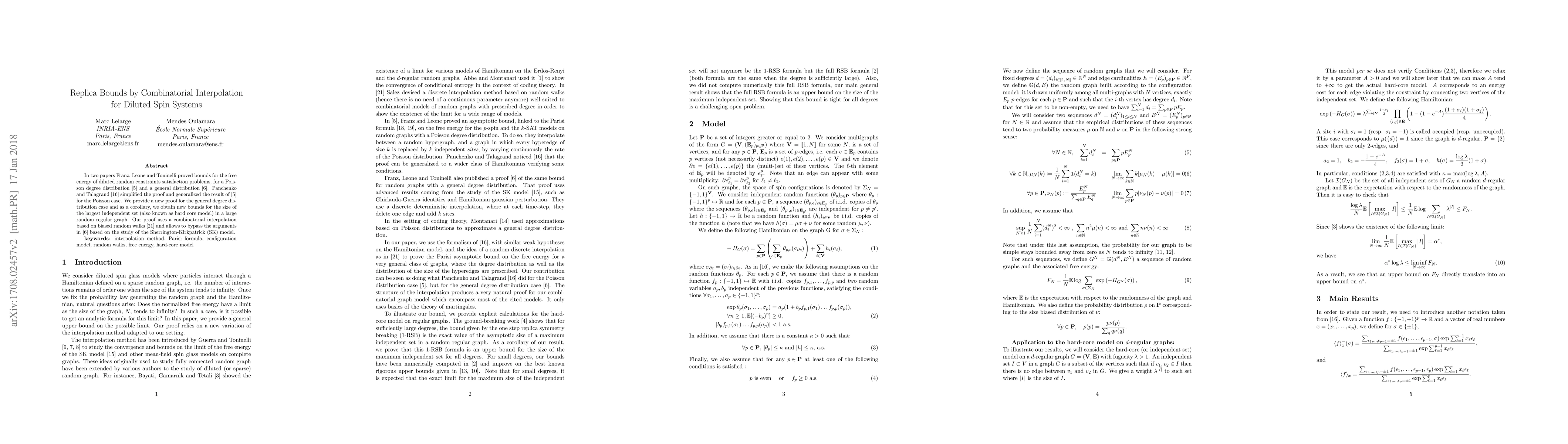 In two papers Franz, Leone and Toninelli proved bounds for the free energy of diluted random constraints satisfaction problems, for a Poisson degree distribution [5] and a general distribution [6]. Panchenko and Talagrand [16] simplified the proof and generalized the result of [5] for the Poisson case. We provide a new proof for the general degree distribution case and as a corollary, we obtain new bounds for the size of the largest independent set (also known as hard core model) in a large random regular graph. Our proof uses a combinatorial interpolation based on biased random walks [21] and allows to bypass the arguments in [6] based on the study of the Sherrington-Kirkpatrick (SK) model.