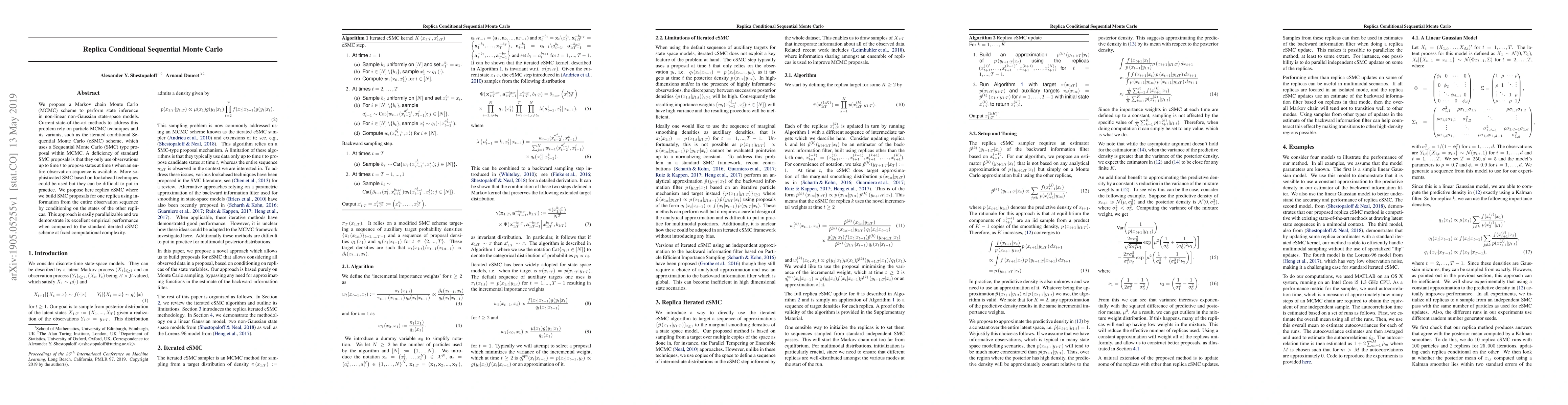 This paper introduces replica conditional Sequential Monte Carlo (cSMC), a parallelizable MCMC scheme for state inference in non-linear non-Gaussian state-space models, which leverages information from the entire observation sequence to improve proposal efficiency over standard SMC methods. The proposed method demonstrates superior empirical performance compared to standard iterated cSMC at equivalent computational cost.