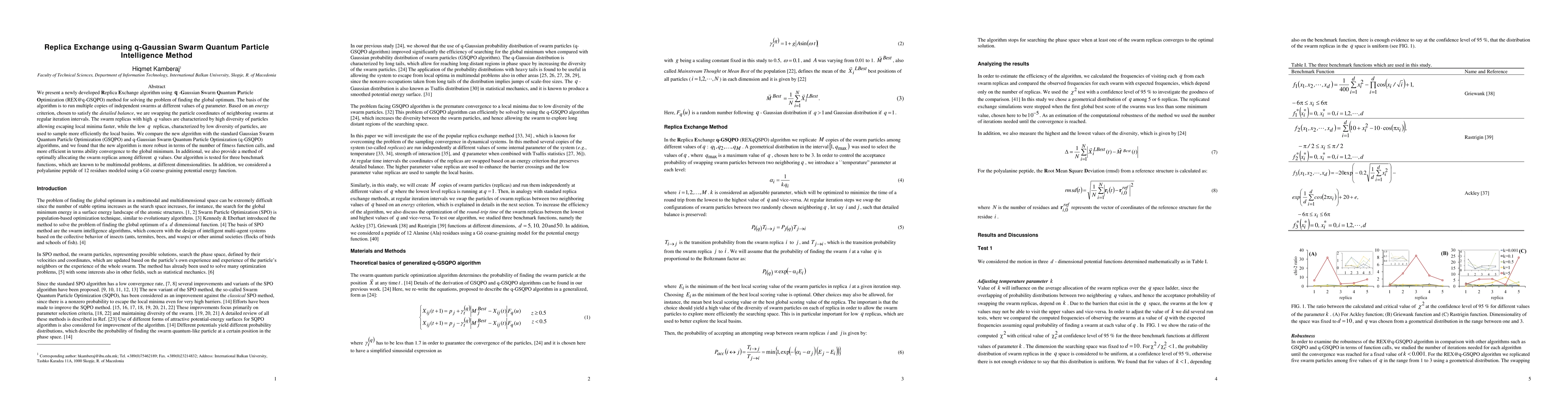 This paper introduces a Replica Exchange algorithm using q-Gaussian Swarm Quantum Particle Optimization (REX@q-GSQPO) to find global optima. It runs multiple swarms at different q values, swapping particles based on energy criteria to balance detailed balance and escape local minima faster. The new method outperforms standard GSQPO and q-GSQPO in robustness and convergence efficiency, tested on benchmark functions and a peptide model.