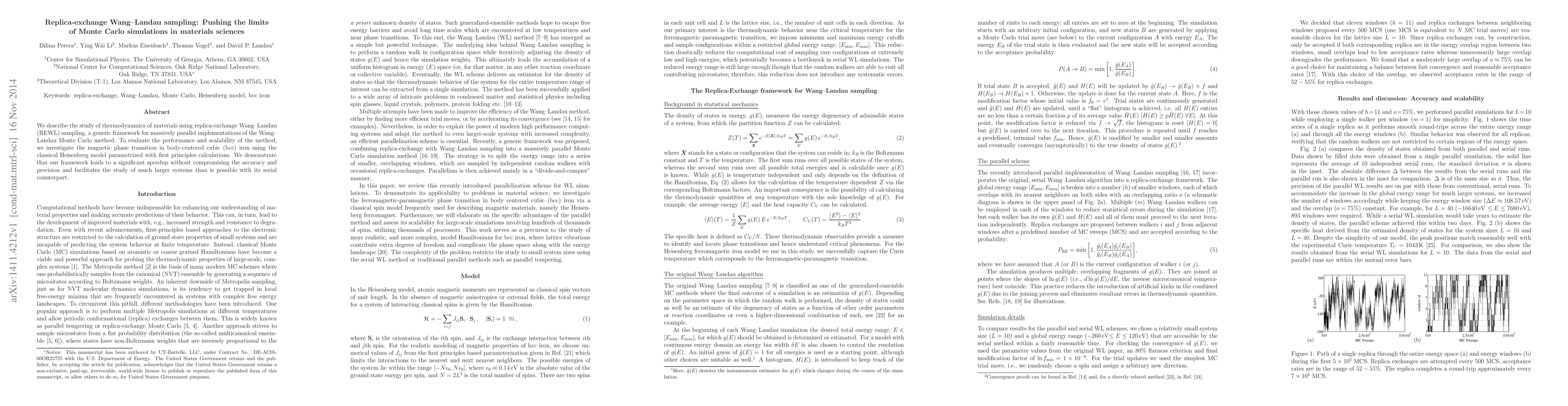 This paper introduces replica-exchange Wang-Landau sampling to enhance Monte Carlo simulations in materials science, demonstrating its effectiveness through the study of magnetic phase transitions in bcc iron. The method achieves significant speedups while maintaining accuracy, enabling the analysis of larger systems compared to traditional serial approaches.