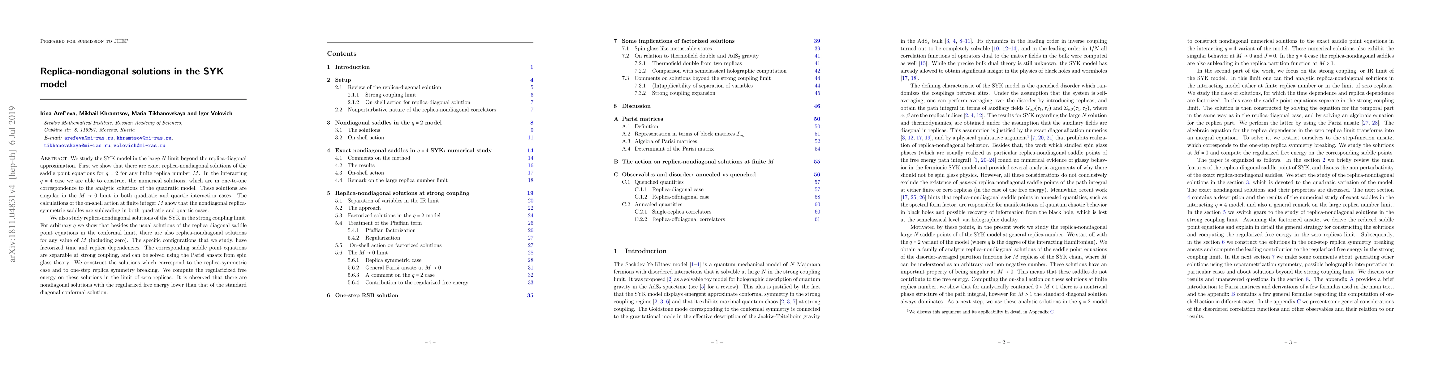 We study the SYK model in the large $N$ limit beyond the replica-diagonal approximation. First we show that there are exact replica-nondiagonal solutions of the saddle point equations for $q=2$ for any finite replica number $M$. In the interacting $q=4$ case we are able to construct the numerical solutions, which are in one-to-one correspondence to the analytic solutions of the quadratic model. These solutions are singular in the $M \to 0$ limit in both quadratic and quartic interaction cases. The calculations of the on-shell action at finite integer $M$ show that the nondiagonal replica-symmetric saddles are subleading in both quadratic and quartic cases. We also study replica-nondiagonal solutions of the SYK in the strong coupling limit. For arbitrary $q$ we show that besides the usual solutions of the replica-diagonal saddle point equations in the conformal limit, there are also replica-nondiagonal solutions for any value of $M$ (including zero). The specific configurations that we study, have factorized time and replica dependencies. The corresponding saddle point equations are separable at strong coupling, and can be solved using the Parisi ansatz from spin glass theory. We construct the solutions which correspond to the replica-symmetric case and to one-step replica symmetry breaking. We compute the regularized free energy on these solutions in the limit of zero replicas. It is observed that there are nondiagonal solutions with the regularized free energy lower than that of the standard diagonal conformal solution.