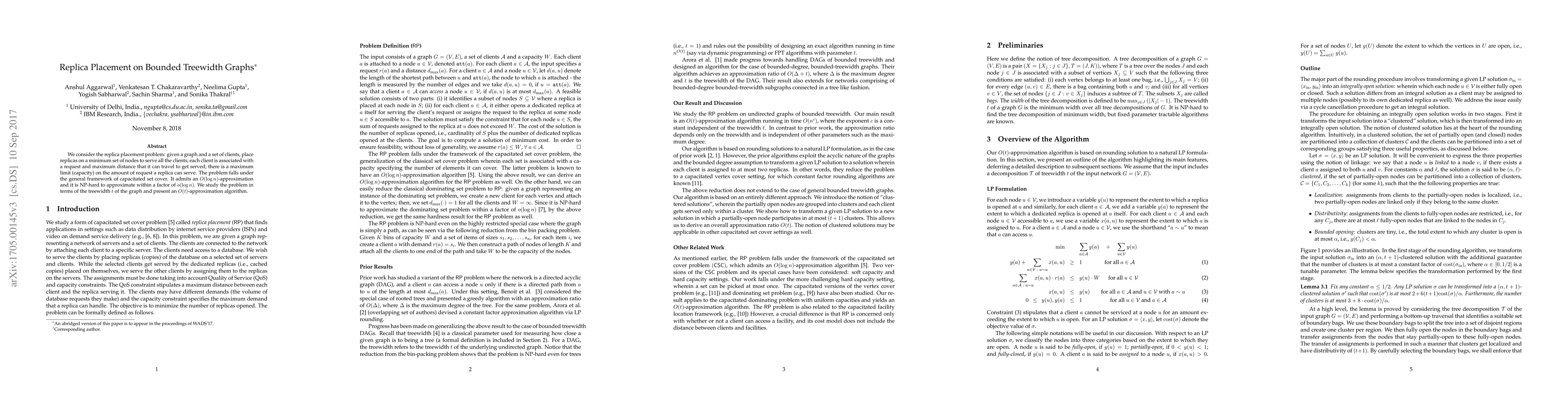 This paper tackles the replica placement problem on graphs with bounded treewidth, optimizing the placement of replicas to serve clients within specified distance and capacity constraints. It introduces an O(t)-approximation algorithm, leveraging the graph's treewidth, and confirms the NP-hardness of approximating the solution better than a logarithmic factor.