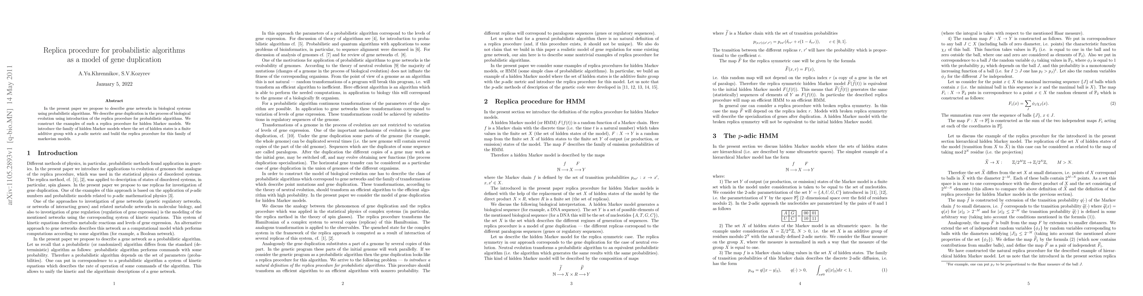 In the present paper we propose to describe gene networks in biological systems using probabilistic algorithms. We describe gene duplication in the process of biological evolution using introduction of the replica procedure for probabilistic algorithms. We construct the examples of such a replica procedure for hidden Markov models. We introduce the family of hidden Markov models where the set of hidden states is a finite additive group with a p-adic metric and build the replica procedure for this family of markovian models.