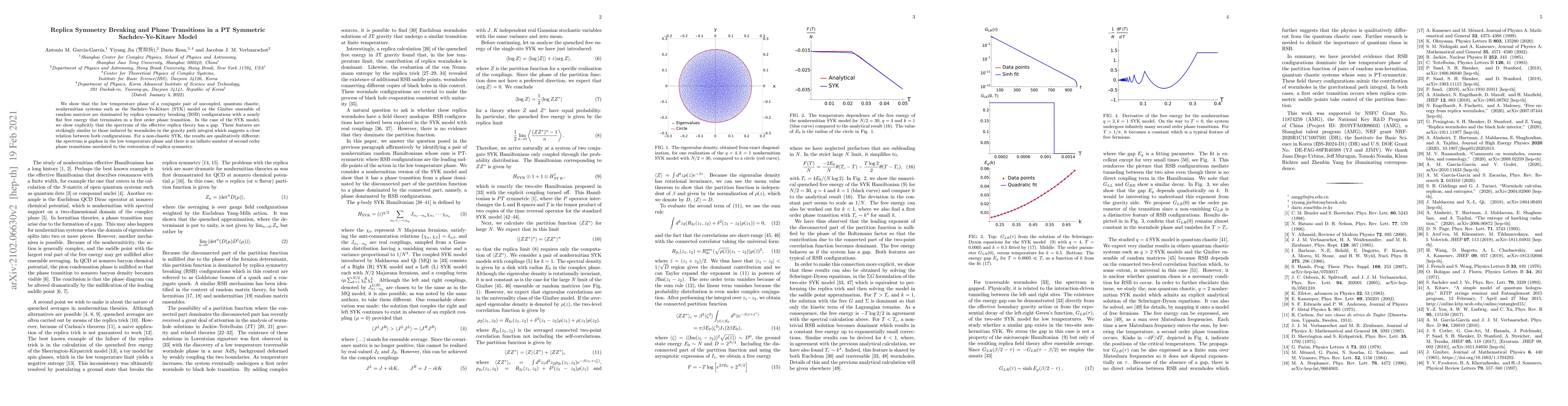 We show that the low temperature phase of a conjugate pair of uncoupled, quantum chaotic, nonhermitian systems such as the Sachdev-Ye-Kitaev (SYK) model or the Ginibre ensemble of random matrices are dominated by replica symmetry breaking configurations with a nearly flat free energy that terminates in a first order phase transition. In the case of the SYK model, we show explicitly that the spectrum of the effective replica theory has a gap. These features are strikingly similar to those induced by wormholes in the gravity path integral which suggests a close relation between both configurations. For a non-chaotic SYK, the results are qualitatively different: the spectrum is gapless in the low temperature phase and there is an infinite number of second order phase transitions unrelated to the restoration of replica symmetry.