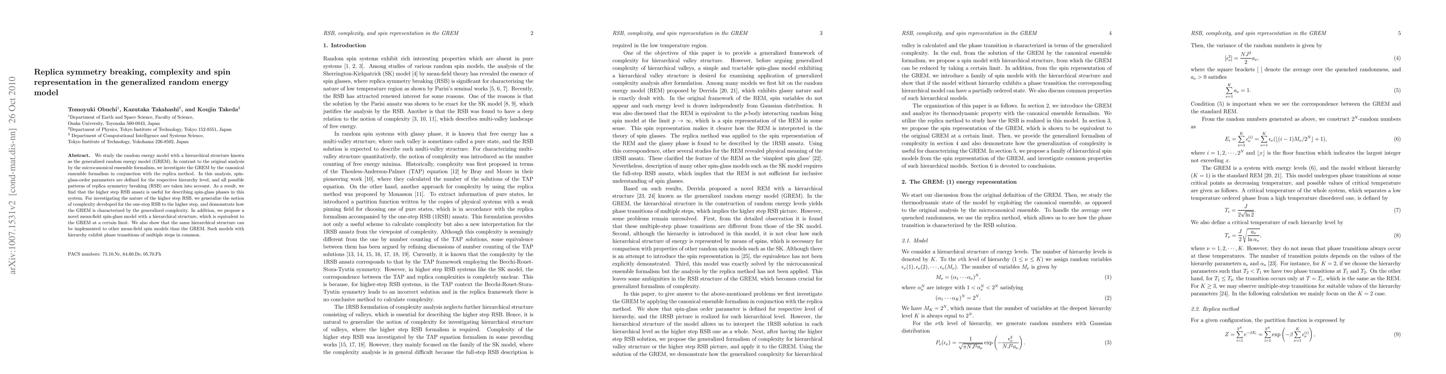 This paper investigates the generalized random energy model (GREM) using the canonical ensemble and replica method, finding that higher step replica symmetry breaking (RSB) describes spin-glass phases. It introduces generalized complexity to characterize the GREM and proposes a novel hierarchical mean-field spin-glass model equivalent to the GREM in certain limits.