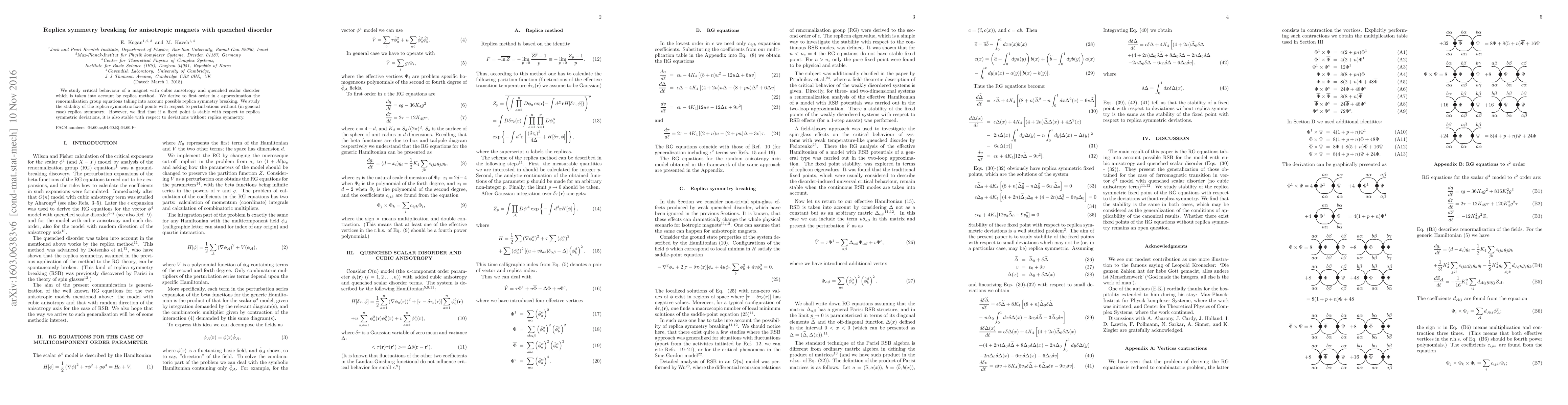 This paper examines the critical behavior of cubic anisotropic magnets with quenched scalar disorder, using the replica method and deriving renormalization group equations to first order. The study finds that stable replica symmetric fixed points also maintain stability under perturbations without replica symmetry.