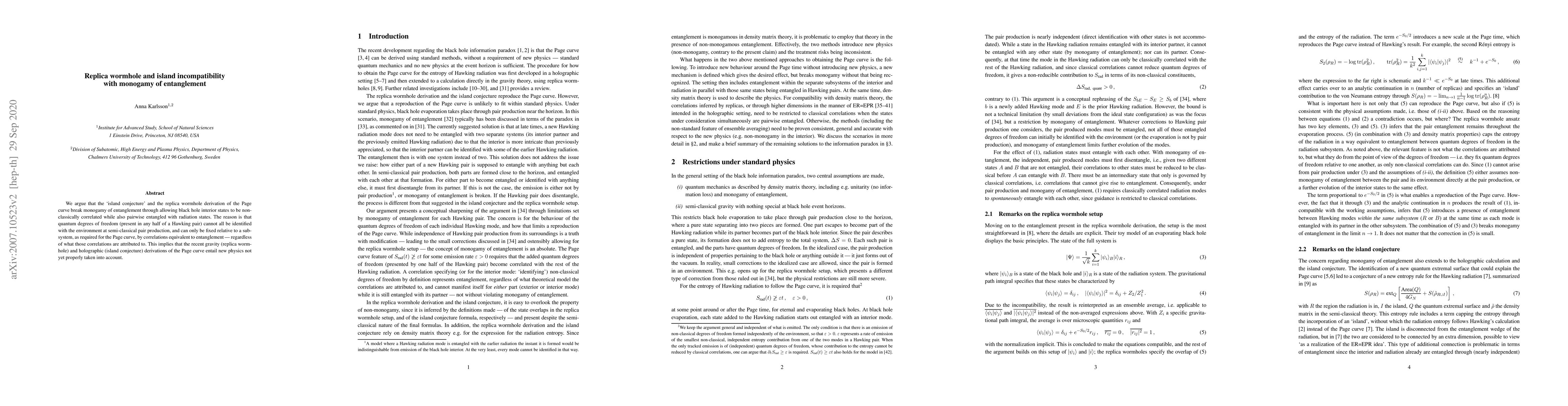 We argue that the `island conjecture' and the replica wormhole derivation of the Page curve break monogamy of entanglement through allowing black hole interior states to be non-classically correlated while also pairwise entangled with radiation states. The reason is that quantum degrees of freedom (present in any half of a Hawking pair) cannot all be identified with the environment at semi-classical pair production, and can only be fixed relative to a subsystem, as required for the Page curve, by correlations equivalent to entanglement - regardless of what those correlations are attributed to. This implies that the recent gravity (replica wormhole) and holographic (island conjecture) derivations of the Page curve entail new physics not yet properly taken into account.