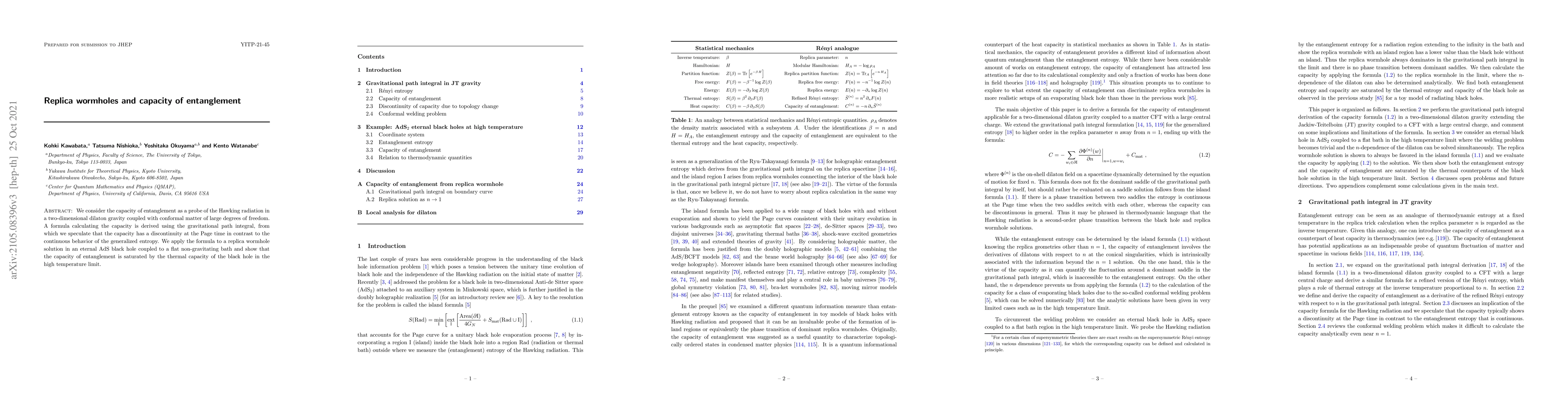 We consider the capacity of entanglement as a probe of the Hawking radiation in a two-dimensional dilaton gravity coupled with conformal matter of large degrees of freedom. A formula calculating the capacity is derived using the gravitational path integral, from which we speculate that the capacity has a discontinuity at the Page time in contrast to the continuous behavior of the generalized entropy. We apply the formula to a replica wormhole solution in an eternal AdS black hole coupled to a flat non-gravitating bath and show that the capacity of entanglement is saturated by the thermal capacity of the black hole in the high temperature limit.