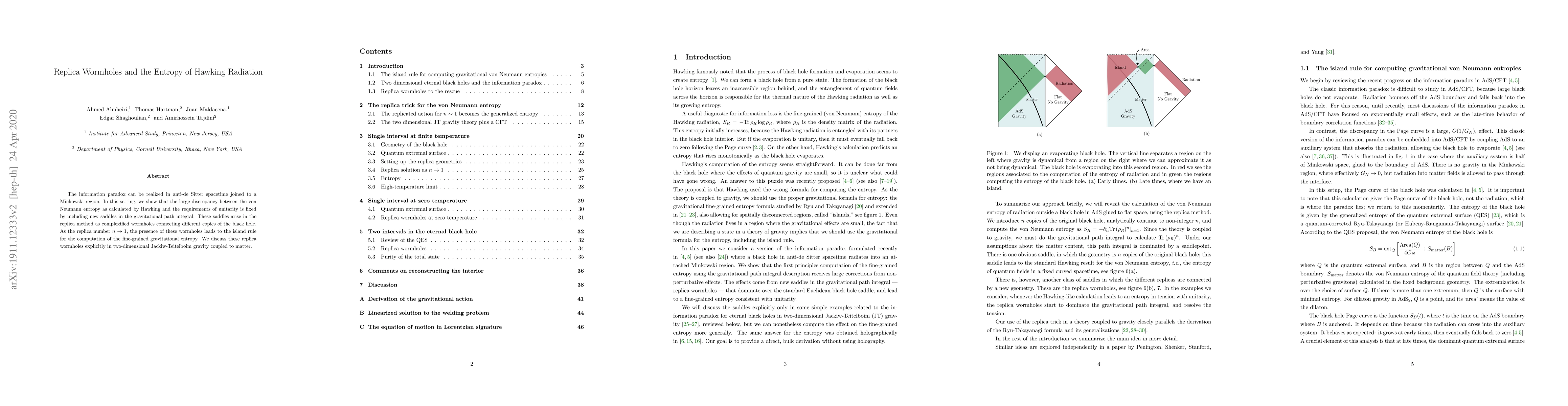 The information paradox can be realized in anti-de Sitter spacetime joined to a Minkowski region. In this setting, we show that the large discrepancy between the von Neumann entropy as calculated by Hawking and the requirements of unitarity is fixed by including new saddles in the gravitational path integral. These saddles arise in the replica method as complexified wormholes connecting different copies of the black hole. As the replica number $n \to 1$, the presence of these wormholes leads to the island rule for the computation of the fine-grained gravitational entropy. We discuss these replica wormholes explicitly in two-dimensional Jackiw-Teitelboim gravity coupled to matter.