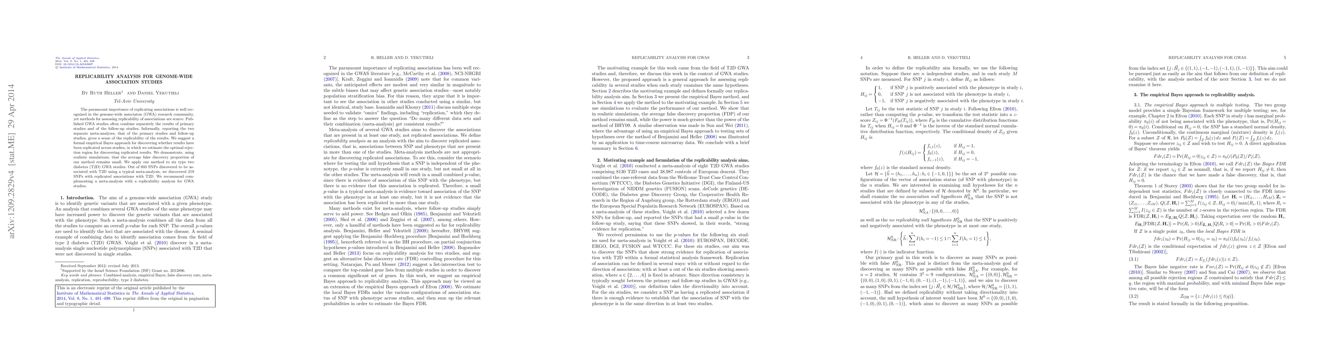 This paper proposes a formal empirical Bayes method to assess the replicability of genome-wide association study (GWAS) findings, demonstrating its effectiveness through simulations and application to T2D studies, where it identified 219 replicated associations out of 803. The authors advocate for combining replicability analysis with traditional meta-analysis in GWAS.