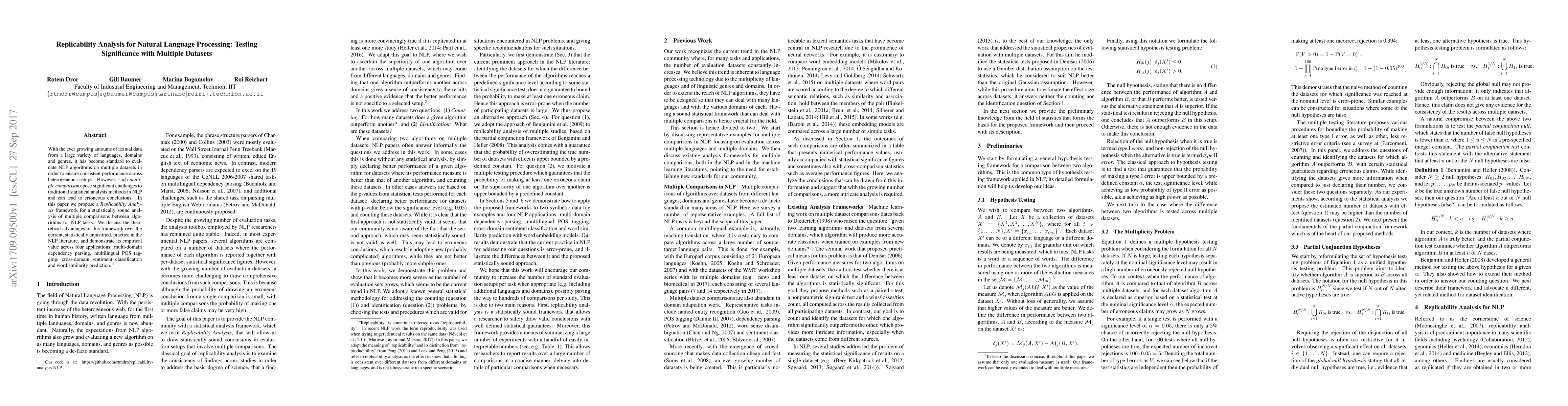 This paper introduces a Replicability Analysis framework to evaluate NLP algorithms on multiple datasets in a statistically sound way, addressing the challenges of traditional statistical analysis methods. The framework shows empirical value across four applications, improving the accuracy and reliability of NLP results.