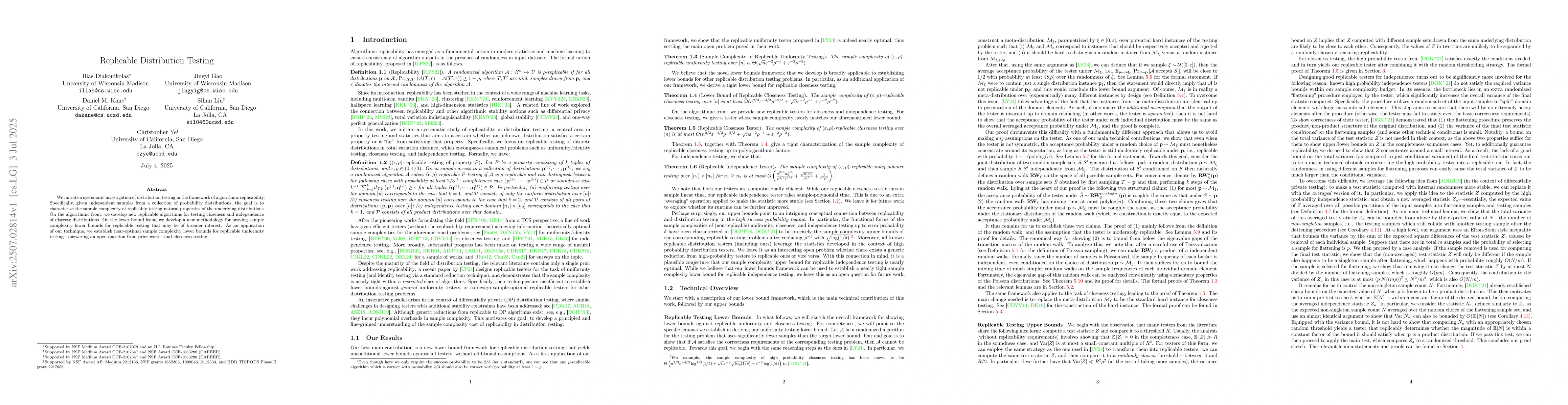 The paper introduces novel replicable algorithms for testing closeness and independence of discrete distributions, along with a new methodology for proving sample complexity lower bounds for replicable testing.