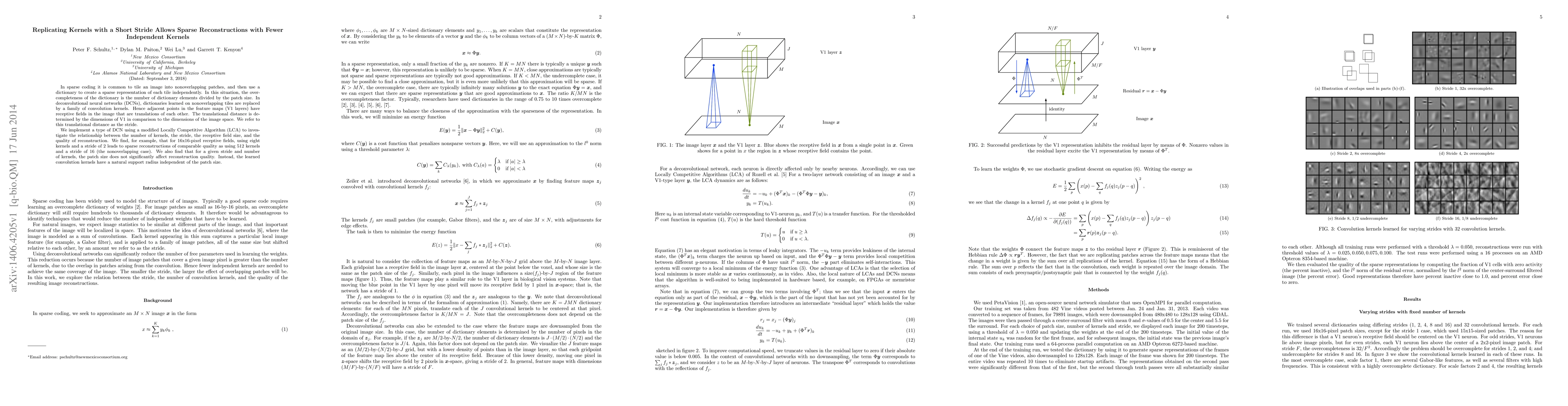 In sparse coding it is common to tile an image into nonoverlapping patches, and then use a dictionary to create a sparse representation of each tile independently. In this situation, the overcompleteness of the dictionary is the number of dictionary elements divided by the patch size. In deconvolutional neural networks (DCNs), dictionaries learned on nonoverlapping tiles are replaced by a family of convolution kernels. Hence adjacent points in the feature maps (V1 layers) have receptive fields in the image that are translations of each other. The translational distance is determined by the dimensions of V1 in comparison to the dimensions of the image space. We refer to this translational distance as the stride. We implement a type of DCN using a modified Locally Competitive Algorithm (LCA) to investigate the relationship between the number of kernels, the stride, the receptive field size, and the quality of reconstruction. We find, for example, that for 16x16-pixel receptive fields, using eight kernels and a stride of 2 leads to sparse reconstructions of comparable quality as using 512 kernels and a stride of 16 (the nonoverlapping case). We also find that for a given stride and number of kernels, the patch size does not significantly affect reconstruction quality. Instead, the learned convolution kernels have a natural support radius independent of the patch size.