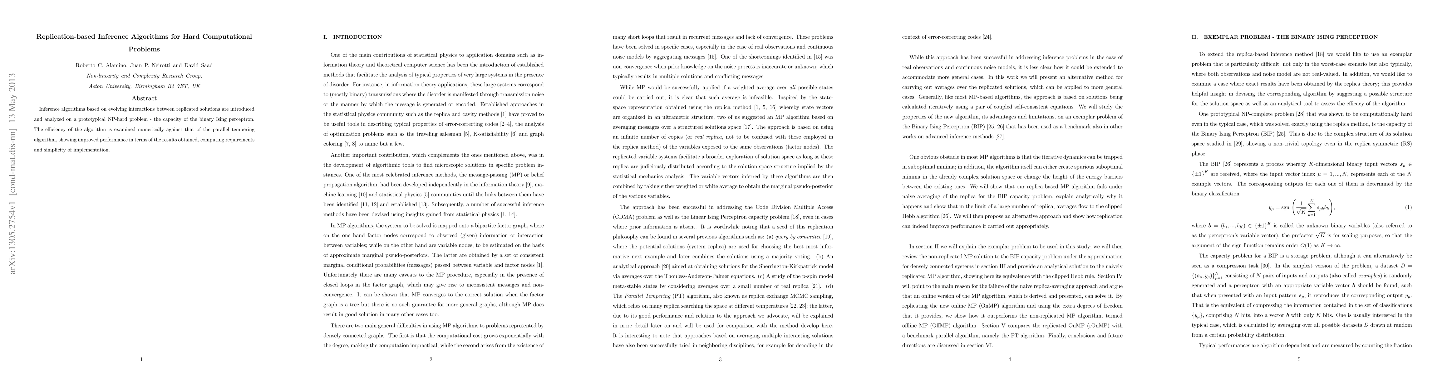 Inference algorithms based on evolving interactions between replicated solutions are introduced and analyzed on a prototypical NP-hard problem - the capacity of the binary Ising perceptron. The efficiency of the algorithm is examined numerically against that of the parallel tempering algorithm, showing improved performance in terms of the results obtained, computing requirements and simplicity of implementation.