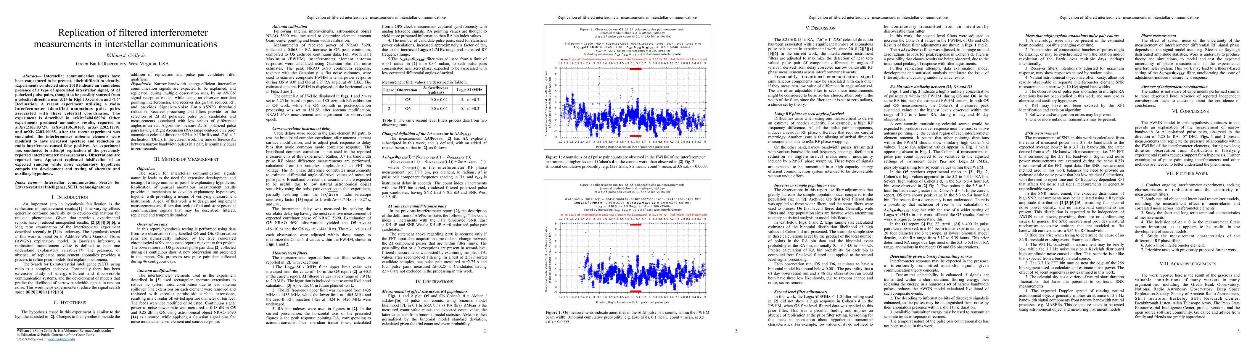 The paper reports on an experiment attempting to replicate previous findings of anomalous delta-t delta-f polarized pulse pairs in interstellar communication signals, utilizing a modified radio interferometer to reduce false positives. The replication appears to confirm the anomalous signals, challenging the hypothesis of random white noise and prompting the development of alternative explanations.