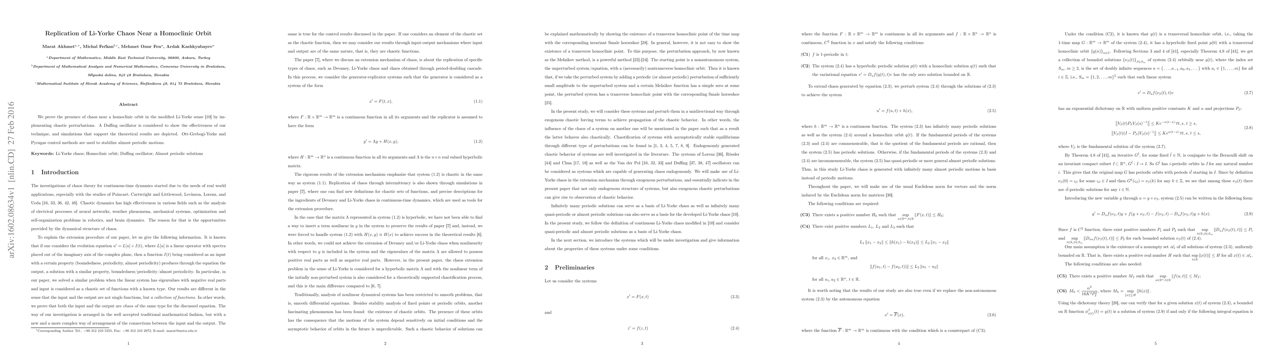 This paper proves the existence of Li-Yorke chaos near a homoclinic orbit through chaotic perturbations, using a Duffing oscillator as a model. Theoretical findings are supported by simulations, and Ott-Grebogi-Yorke and Pyragas control methods are applied to stabilize periodic motions.
