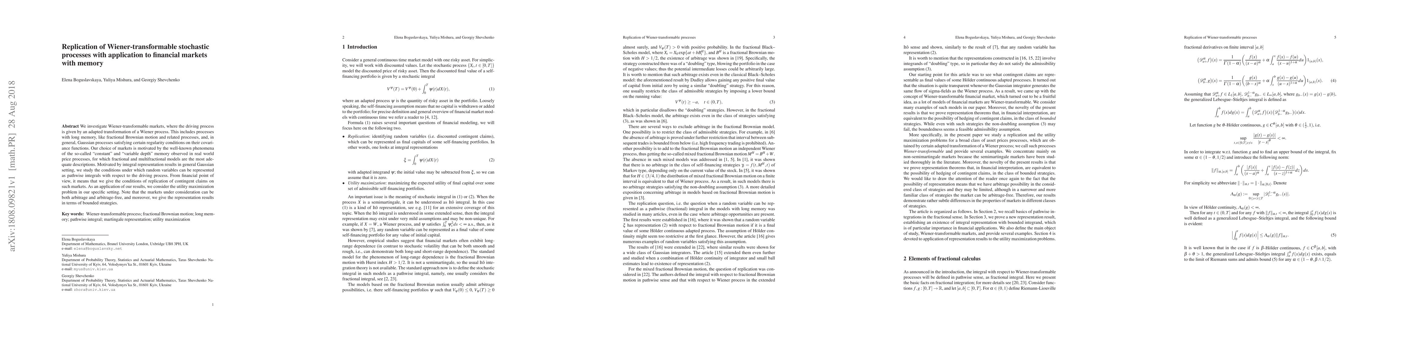 This paper explores Wiener-transformable stochastic processes for financial markets exhibiting memory effects, focusing on fractional Brownian motion and related Gaussian processes. It provides conditions for replicating contingent claims and examines utility maximization in these markets, applicable to both arbitrage and arbitrage-free scenarios.