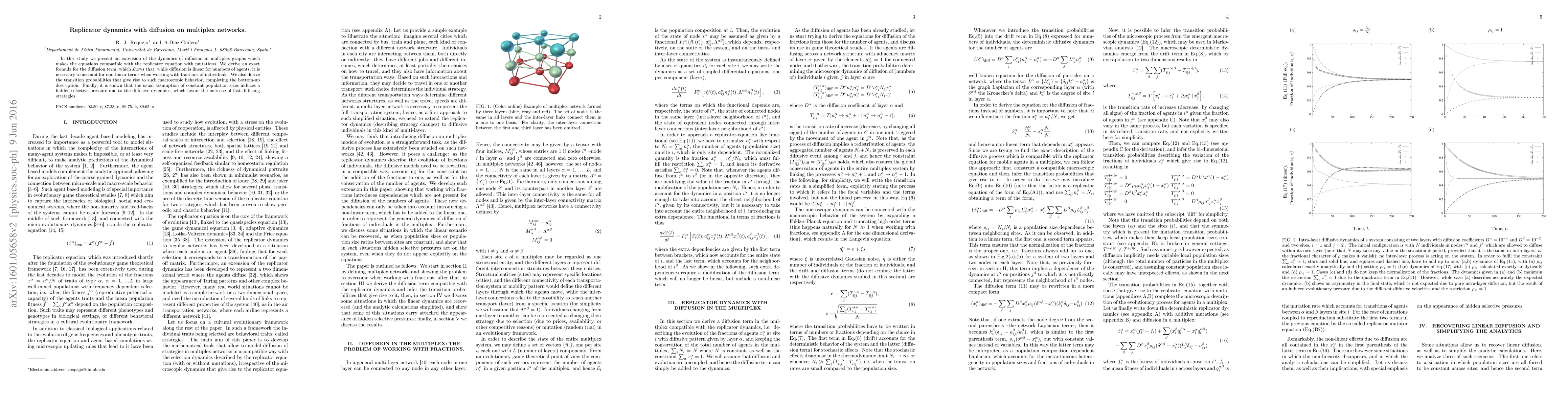 Researchers extend replicator equation to multiplex networks with diffusion, finding non-linear terms are necessary for fractions of individuals and revealing hidden selective pressure when population sizes are assumed constant.