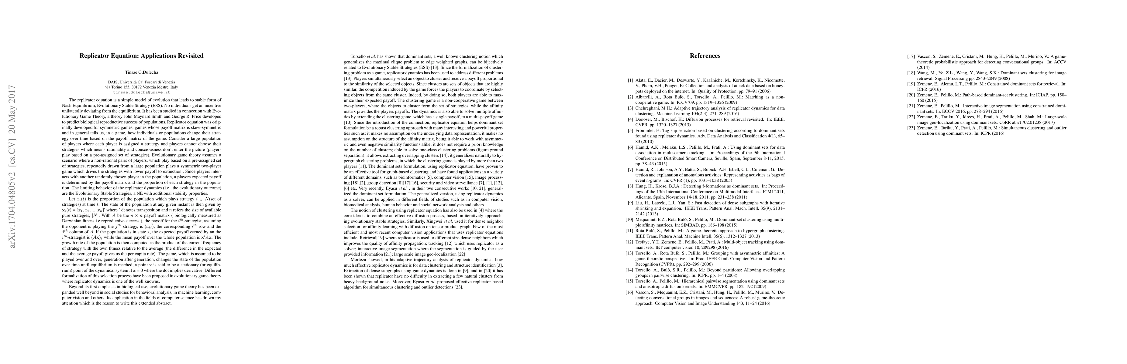 The replicator equation is a simple model of evolution that leads to stable form of Nash Equilibrium, Evolutionary Stable Strategy (ESS). It has been studied in connection with Evolutionary Game Theory and was originally developed for symmetric games. Beyond its first emphasis in biological use, evolutionary game theory has been expanded well beyond in social studies for behavioral analysis, in machine learning, computer vision and others. Its several applications in the fields of machine learning and computer vision has drawn my attention which is the reason to write this extended abstract