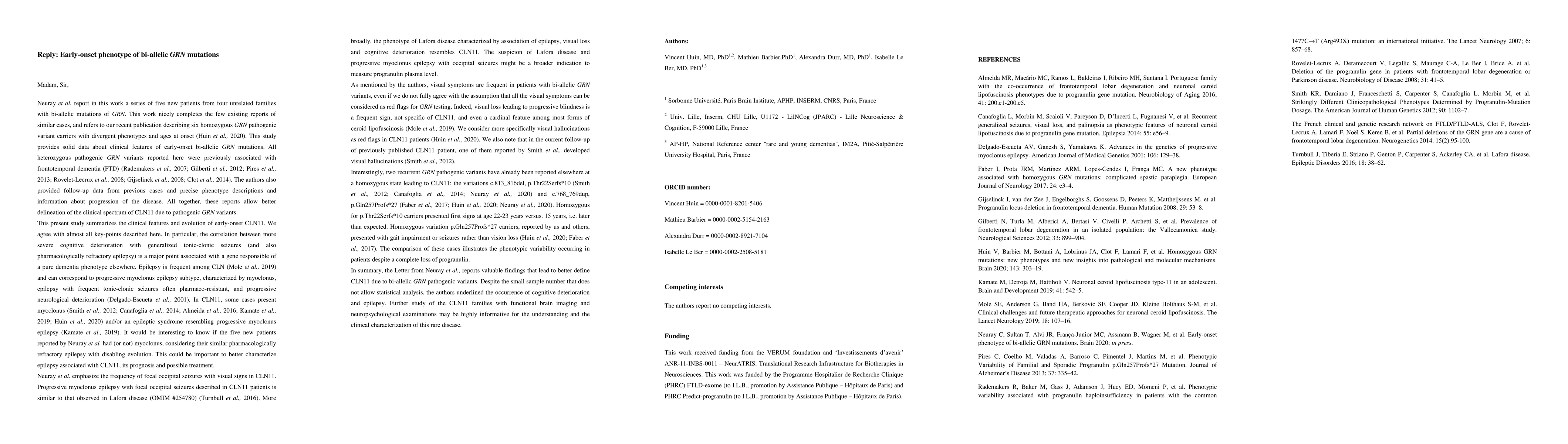 We would like to reply to Neuray et al. who report a series of five new patients from four unrelated families with bi-allelic mutations of GRN. Their work nicely completes the few existing reports of similar cases, and refers to our recent publication describing six homozygous GRN pathogenic variant carriers with divergent phenotypes and ages at onset (Huin et al., 2020). In summary, the Letter from Neuray et al., reports valuable findings that lead to better define CLN11 due to bi-allelic GRN pathogenic variants. Despite the small sample number that does not allow statistical analysis, the authors underlined the occurrence of cognitive deterioration and epilepsy. Further study of the CLN11 families with functional brain imaging and neuropsychological examinations may be highly informative for the understanding and the clinical characterization of this rare disease.