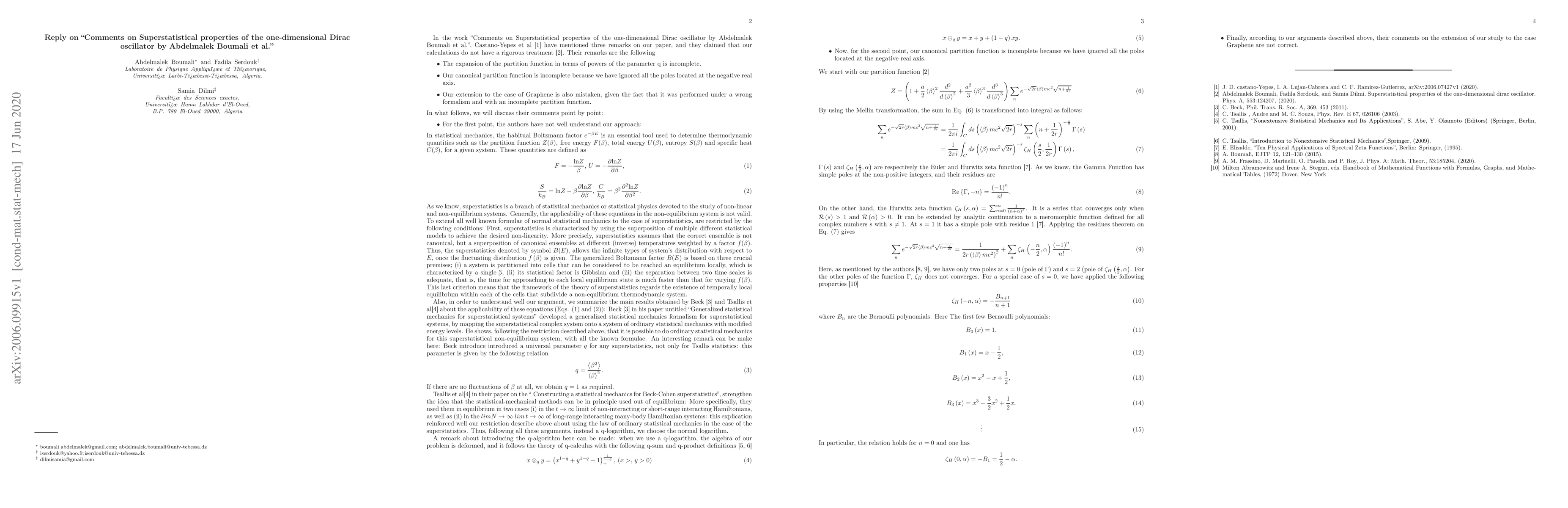 This paper addresses and clarifies the comments made by Castanos-Yepes et al. regarding the original study on the superstatistical properties of the one-dimensional Dirac oscillator, aiming to resolve any misunderstandings and provide additional insights.