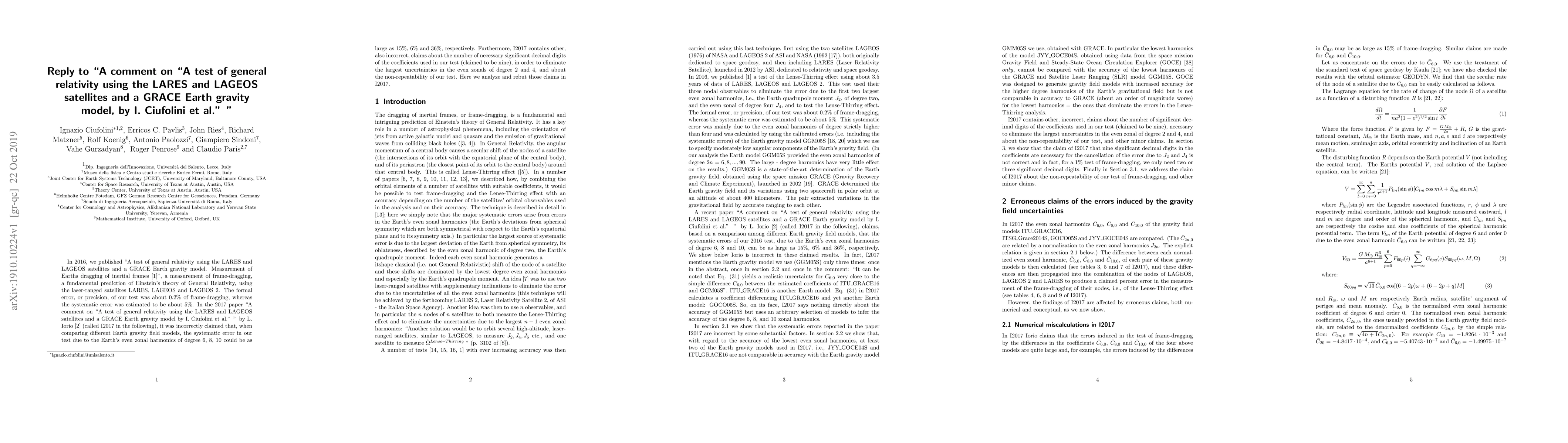 In 2016, we published "A test of general relativity using the LARES and LAGEOS satellites and a GRACE Earth gravity model. Measurement of Earth's dragging of inertial frames [1]", a measurement of frame-dragging, a fundamental prediction of Einstein's theory of General Relativity, using the laser-ranged satellites LARES, LAGEOS and LAGEOS 2. The formal error, or precision, of our test was about 0.2% of frame-dragging, whereas the systematic error was estimated to be about 5%. In the 2017 paper "A comment on "A test of general relativity using the LARES and LAGEOS satellites and a GRACE Earth gravity model by I. Ciufolini et al." "by L. Iorio [2] (called I2017 in the following), it was incorrectly claimed that, when comparing different Earth gravity field models, the systematic error in our test due to the Earth's even zonal harmonics of degree 6, 8, 10 could be aslarge as 15%, 6% and 36%, respectively. Furthermore, I2017 contains other, also incorrect, claims about the number of necessary significant decimal digits of the coefficients used in our test (claimed to be nine), in order to eliminate the largest uncertainties in the even zonals of degree 2 and 4, and about the non-repeatability of our test. Here we analyze and rebut those claims in I2017.