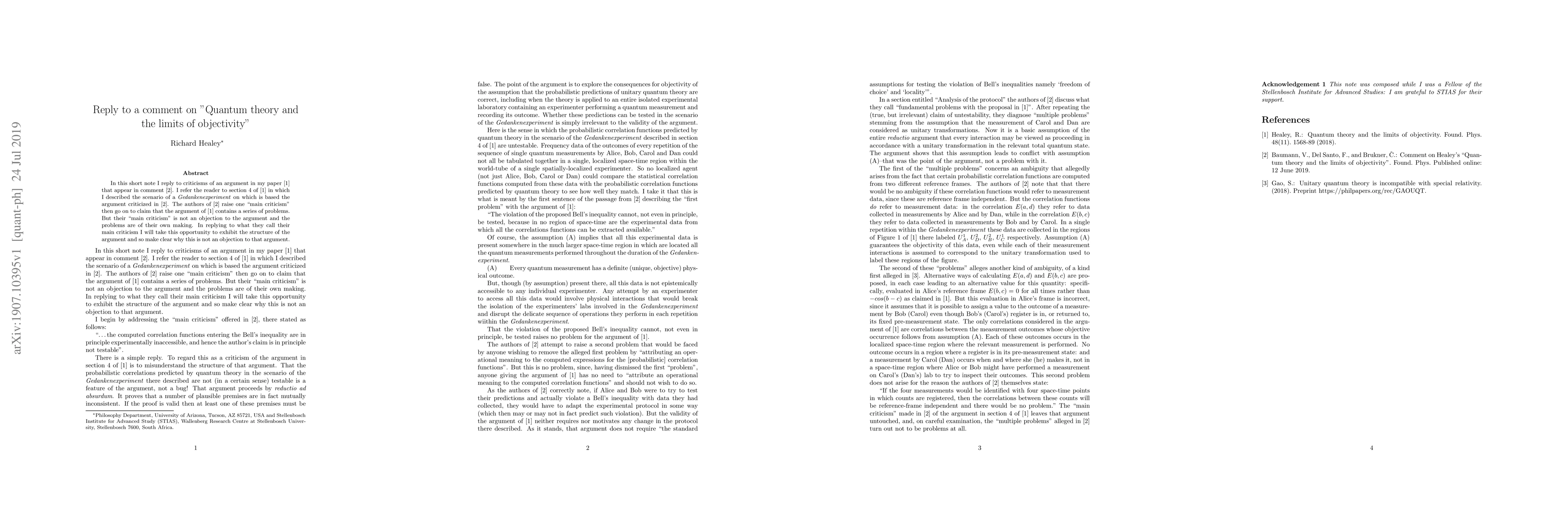 In this short note I reply to criticisms of an argument in my paper [1] that appear in comment [2]. I refer the reader to section 4 of [1] in which I described the scenario of a Gedankenexperiment on which is based the argument criticized in [2]. The authors of [2] raise one "main criticism" then go on to claim that the argument of [1] contains a series of problems. But their "main criticism" is not an objection to the argument and the problems are of their own making. In replying to what they call their main criticism I will take this opportunity to exhibit the structure of the argument and so make clear why this is not an objection to that argument.