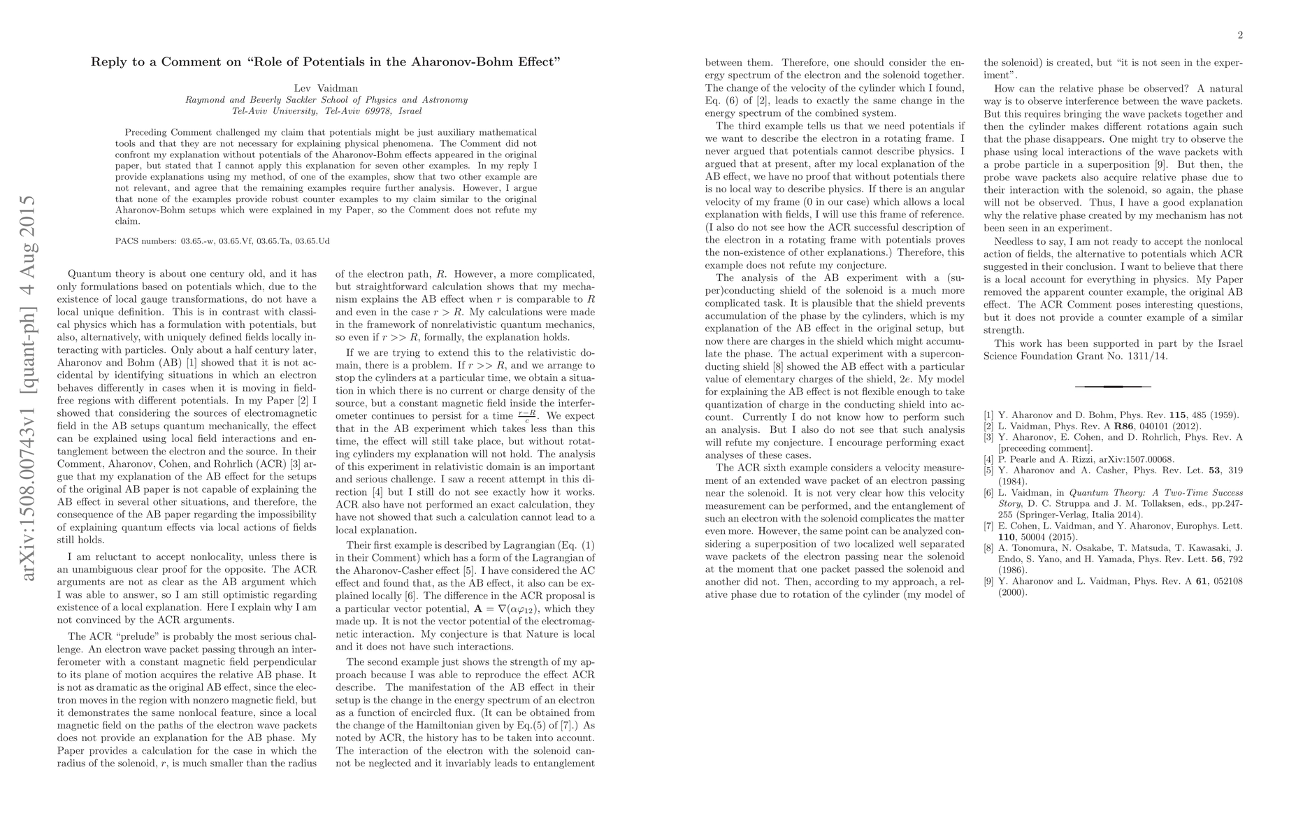 Preceding Comment challenged my claim that potentials might be just auxiliary mathematical tools and that they are not necessary for explaining physical phenomena. The Comment did not confront my explanation without potentials of the Aharonov-Bohm effects appeared in the original paper, but stated that I cannot apply this explanation for seven other examples. In my reply I provide explanations using my method, of one of the examples, show that two other example are not relevant, and agree that the remaining examples require further analysis. However, I argue that none of the examples provide robust counter examples to my claim similar to the original Aharonov-Bohm setups which were explained in my Paper, so the Comment does not refute my claim.