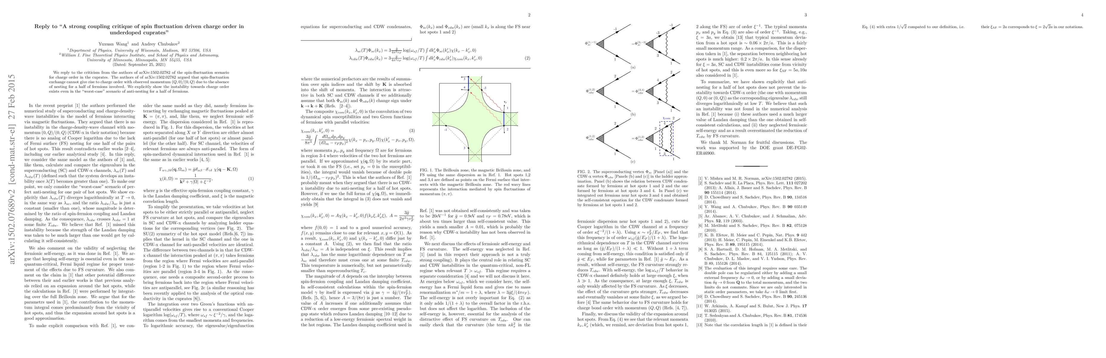 We reply to the criticism from the authors of arXiv:1502.02782 of the spin-fluctuation scenario for charge order in the cuprates. The authors of of arXiv:1502.02782 argued that spin-fluctuation exchange cannot give rise to charge order with observed momentum $(Q, 0)/(0, Q)$ due to the absence of nesting for a half of fermions involved. We explicitly show the instability towards charge order exists even in the "worst-case" scenario of anti-nesting for a half of fermions.