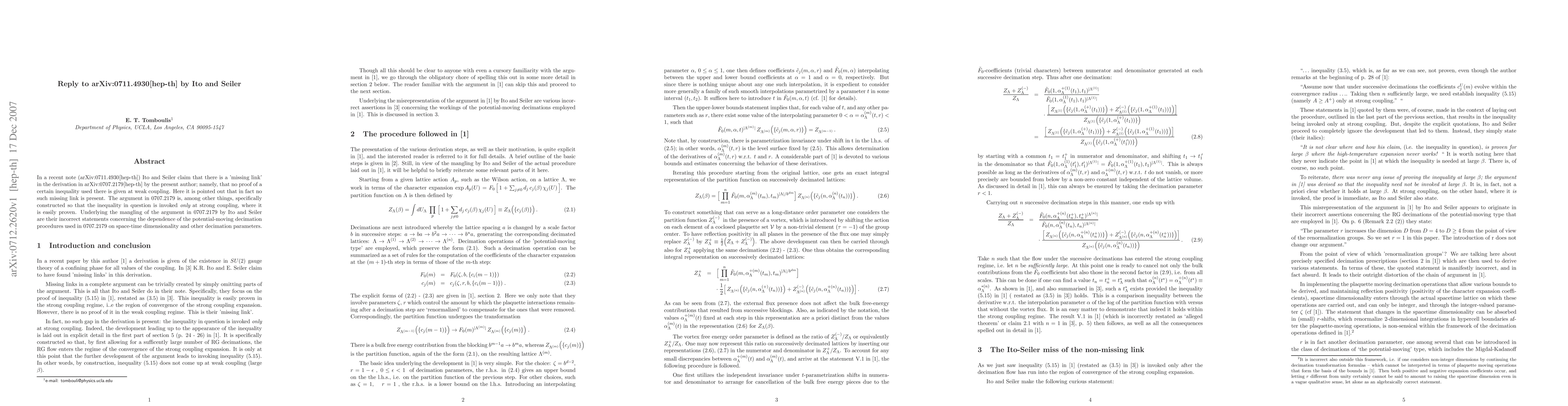 In a recent note (arXiv:0711.4930[hep-th]) Ito and Seiler claim that there is a 'missing link' in the derivation in arXiv:0707.2179[hep-th] by the present author; namely, that no proof of a certain inequality used there is given at weak coupling. Here it is pointed out that in fact no such missing link is present. The argument in 0707.2179 is, among other things, specifically constructed so that the inequality in question is invoked {\it only} at strong coupling, where it is easily proven. Underlying the mangling of the argument in 0707.2179 by Ito and Seiler are their incorrect statements concerning the dependence of the potential-moving decimation procedures used in 0707.2179 on space-time dimensionality and other decimation parameters.