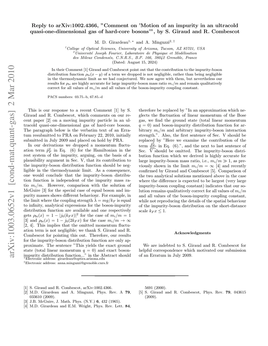 In their Comment [1] Giraud and Combescot point out that the contribution to the impurity-boson distribution function $\rho_{bi}(x-y)$ of a term we dropped is not negligible, rather than being negligible in the thermodynamic limit as we had conjectured. We now agree with them, but nevertheless our results for $\rho_{bi}$ are highly accurate for large impurity-boson mass ratio $m_i/m$ and remain qualitatively correct for all values of $m_i/m$ and all values of the boson-impurity coupling constant.