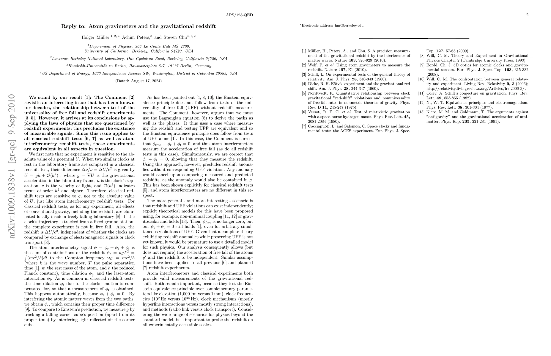 Researchers stand by their previous findings on atom gravimeters and gravitational redshift, arguing that a recent comment misapplies questionable physics laws, rendering the results equivalent to classical redshift tests.