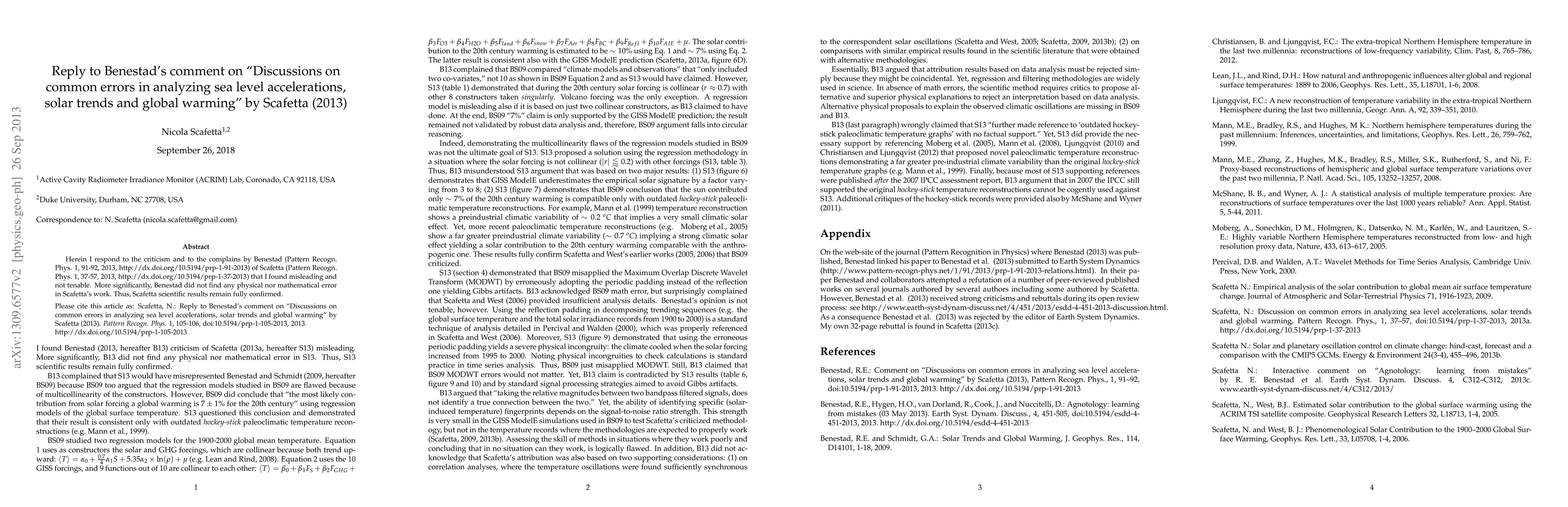 This paper defends Scafetta's analysis of sea level accelerations, solar trends, and global warming against Benestad's critique, asserting that no physical or mathematical errors were found in Scafetta's work and that his scientific conclusions remain valid.