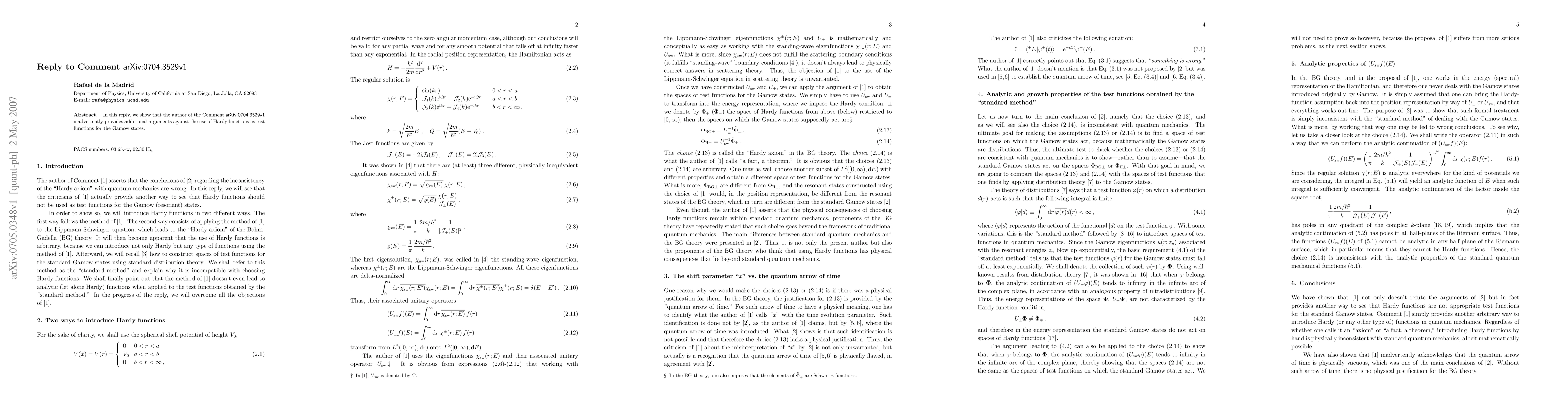 In this reply, we show that the author of the Comment arXiv:0704.3529v1 inadvertently provides additional arguments against the use of Hardy functions as test functions for the Gamow states.
