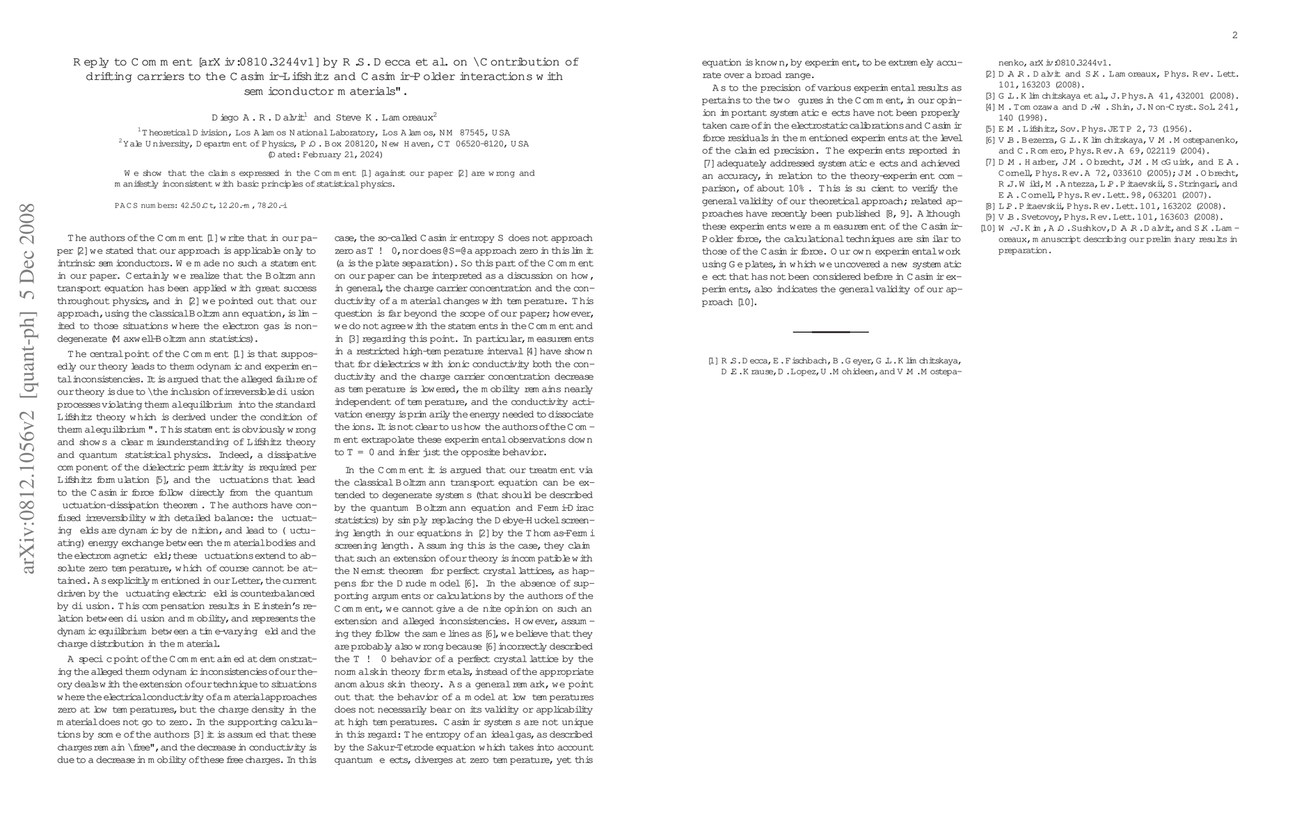 We show that the claims expressed in the Comment arXiv:0810.3244v1 by R.S. Decca et al against our paper, D.A.R. Dalvit and S.K. Lamoreaux, Phys. Rev. Lett. {\bf 101}, 163203 (2008), are wrong and manifestly inconsistent with basic principles of statistical physics.