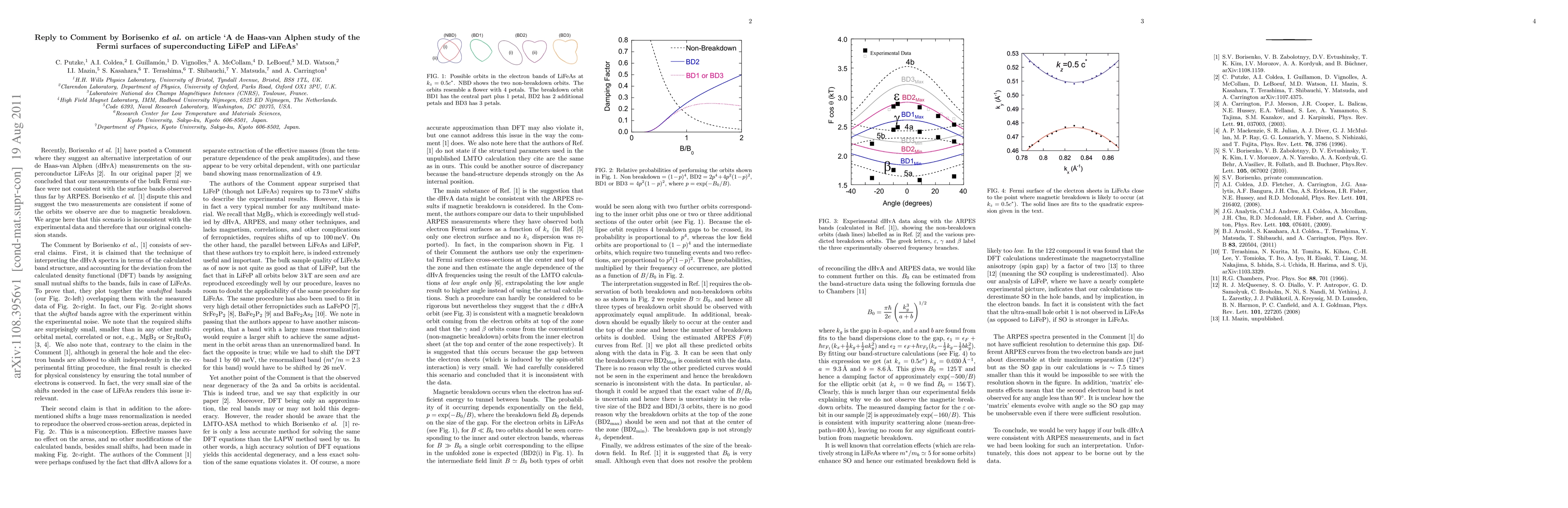Recently, Borisenko et al have posted a Comment (arXiv:1108.1159) where they suggest an alternative interpretation of our de Haas-van Alphen (dHvA) measurements on the superconductor LiFeAs. In our original paper (arXiv:1107.4375) we concluded that our measurements of the bulk Fermi surface were not consistent with the surface bands observed thus far by ARPES. Borisenko et al dispute this and suggest the two measurements are consistent if some of the orbits we observe are due to magnetic breakdown. We argue here that this scenario is inconsistent with the experimental data and therefore that our original conclusion stands.