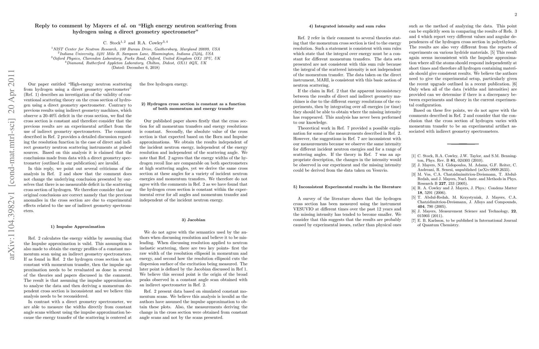 In this reply, we point out several criticisms of the analysis in arXiv:0909.2633 and show that the comment does not change the underlying conclusion presented by ourselves that there is no measurable deficit in the scattering cross section of hydrogen. We therefore consider that our original conclusions are correct namely that the previous anomalies in the cross section are due to experimental effects related to the use of indirect geometry spectrometers.