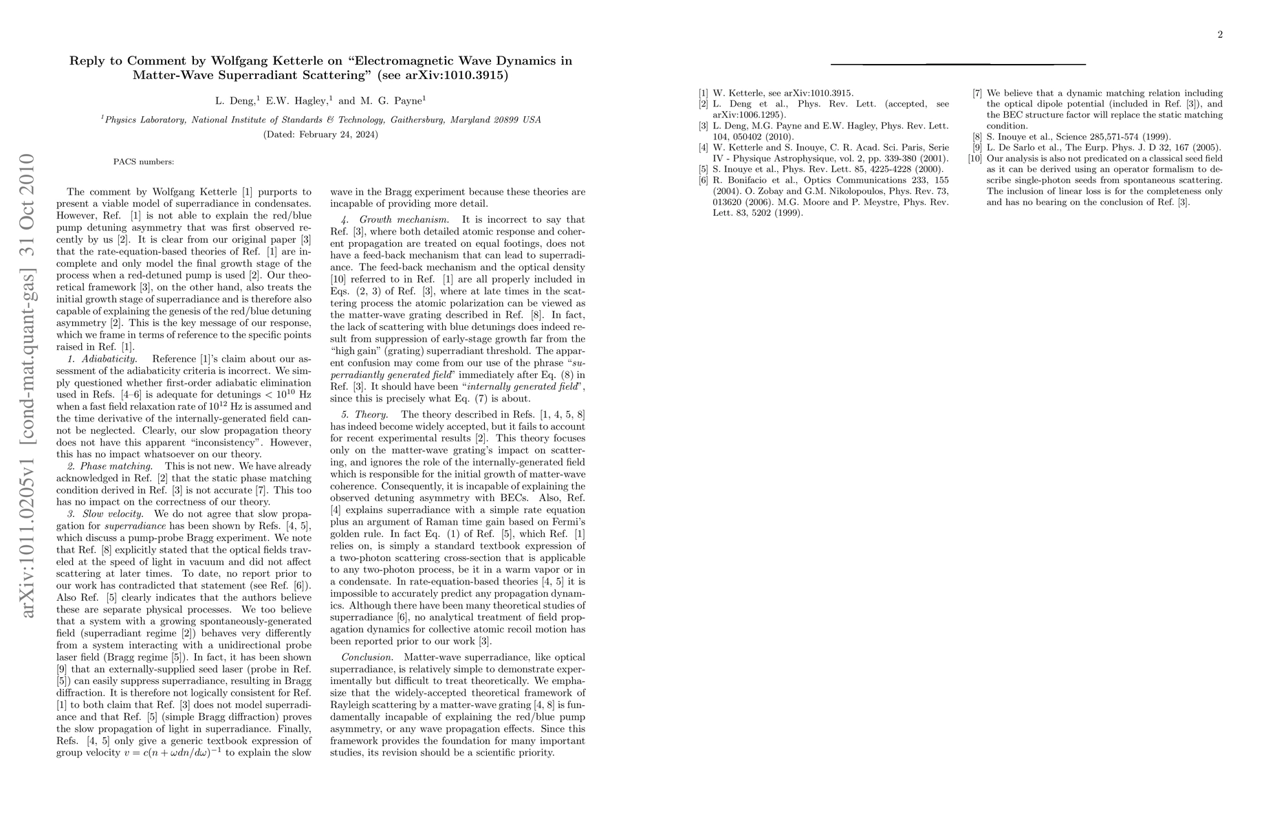 The Comment by Wolfgang Ketterle (Ref.[1]) purports to present a viable model of superradiance in condensates. However, Ref.[1] is not able to explain the red/blue pump detuning asymmetry that was first observed recently by us (Ref.[2]). It is clear from our original paper (Ref.[3]) that the rate-equation-based theories of Ref.[1] are incomplete since they only model the final growth stage of the process when a red-detuned pump is used. Our theoretical framework (Ref.[3]), on the other hand, also treats the initial growth stage of superradiance and is therefore also capable of explaining the genesis of the red/blue detuning asymmetry (Ref.[2]). This is the key message of our response, which we frame in terms of reference to the specific points raised in Ref. [1].