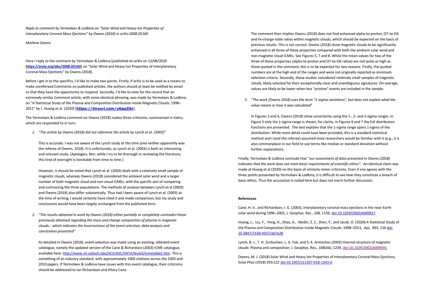 Here I reply to the comment by Yermolaev and Lodkina [arXiv:2008.05160] on "Solar Wind and Heavy Ion Properties of Interplanetary Coronal Mass Ejections" by Owens (2018).