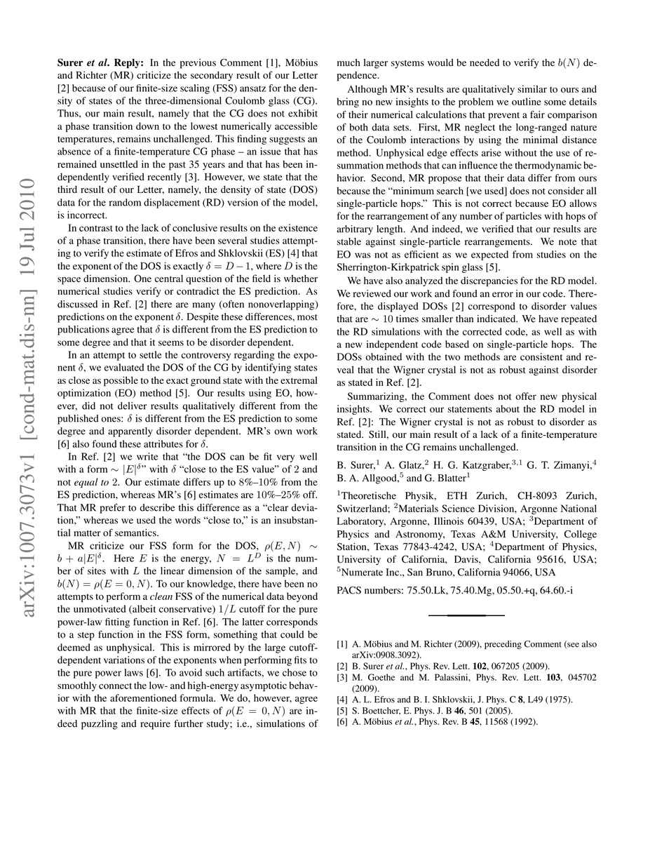 We reply to the Comment by Mobius and Richter [arXiv:0908.3092, Phys. Rev. Lett. 105, 039701 (2010)] on "Density of States and Critical Behavior of the Coulomb Glass" [arXiv:0805.4640, Phys. Rev. Lett. 102, 067205 (2009)] and address the issues raised with our results on the density of states. In addition, we correct our statements about the random displacement version of the Coulomb glass model where the Wigner crystal is not as robust to disorder as stated. Still, our main result of a lack of a finite-temperature transition in the Coulomb glass remains unchallenged.