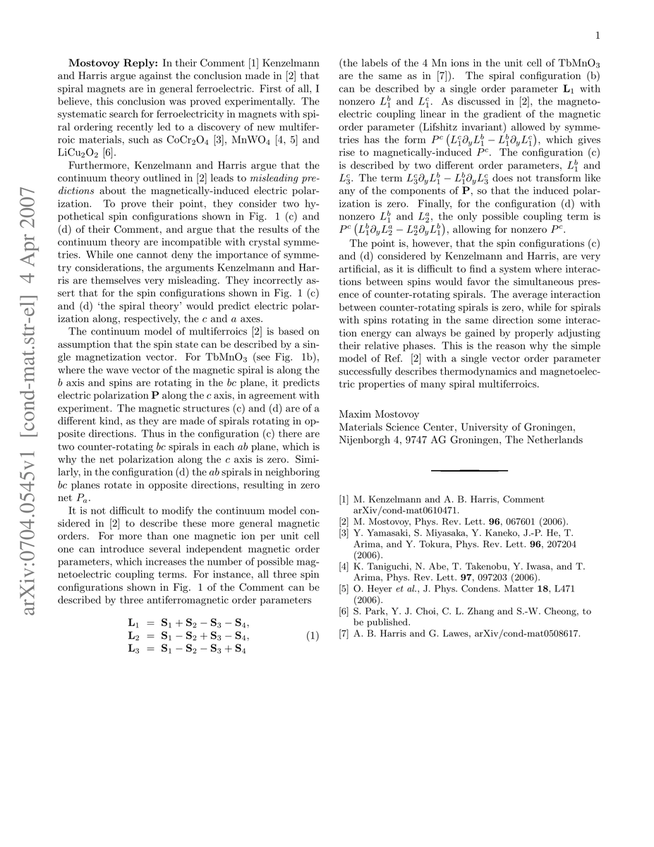 In response to the comment of Kenzelmann and Harris I show how the continuum theory of spiral multiferroics can be modified to describe general magnetic orders and discuss why the microscopic mechanism of magnetically-induced ferroelectricity usually makes such modifications unnecessary. This explains why the simple model with a single vector order parameter successfully describes thermodynamics and magnetoelectric properties of many spiral multiferroics.