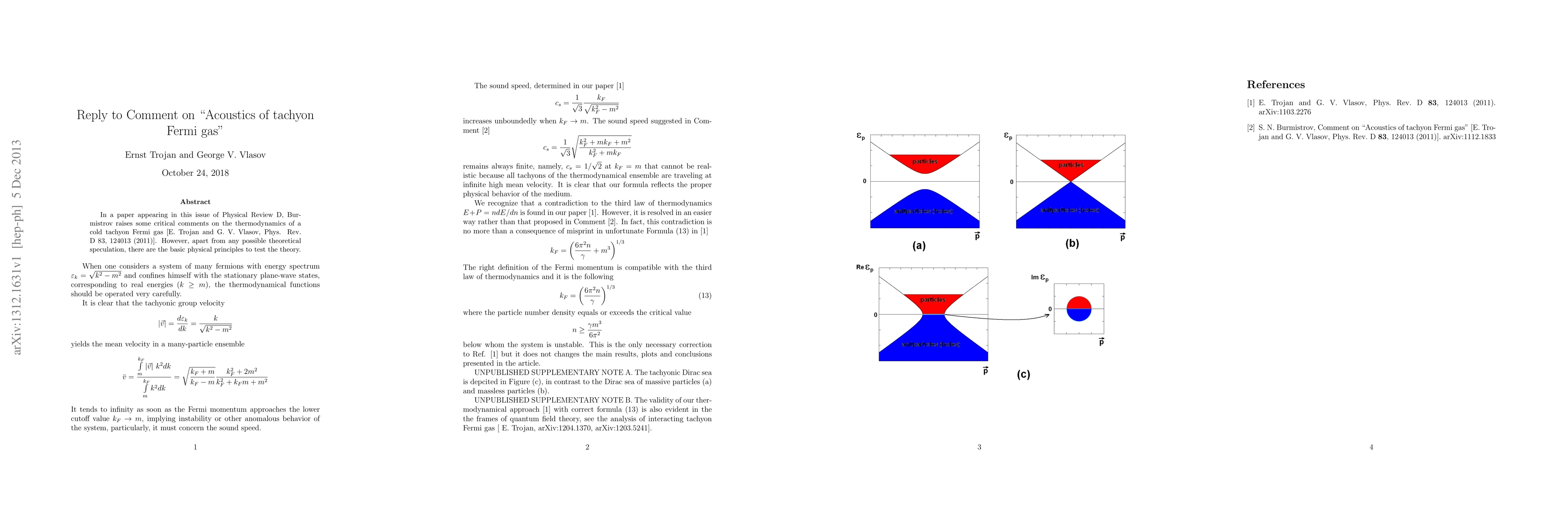 In a paper appearing in this issue of Physical Review D, Burmistrov raises some critical comments on the thermodynamics of a cold tachyon Fermi gas [E. Trojan and G. V. Vlasov, Phys. Rev. D 83, 124013 (2011)]. However, apart from any possible theoretical speculation, there are the basic physical principles to test the theory.