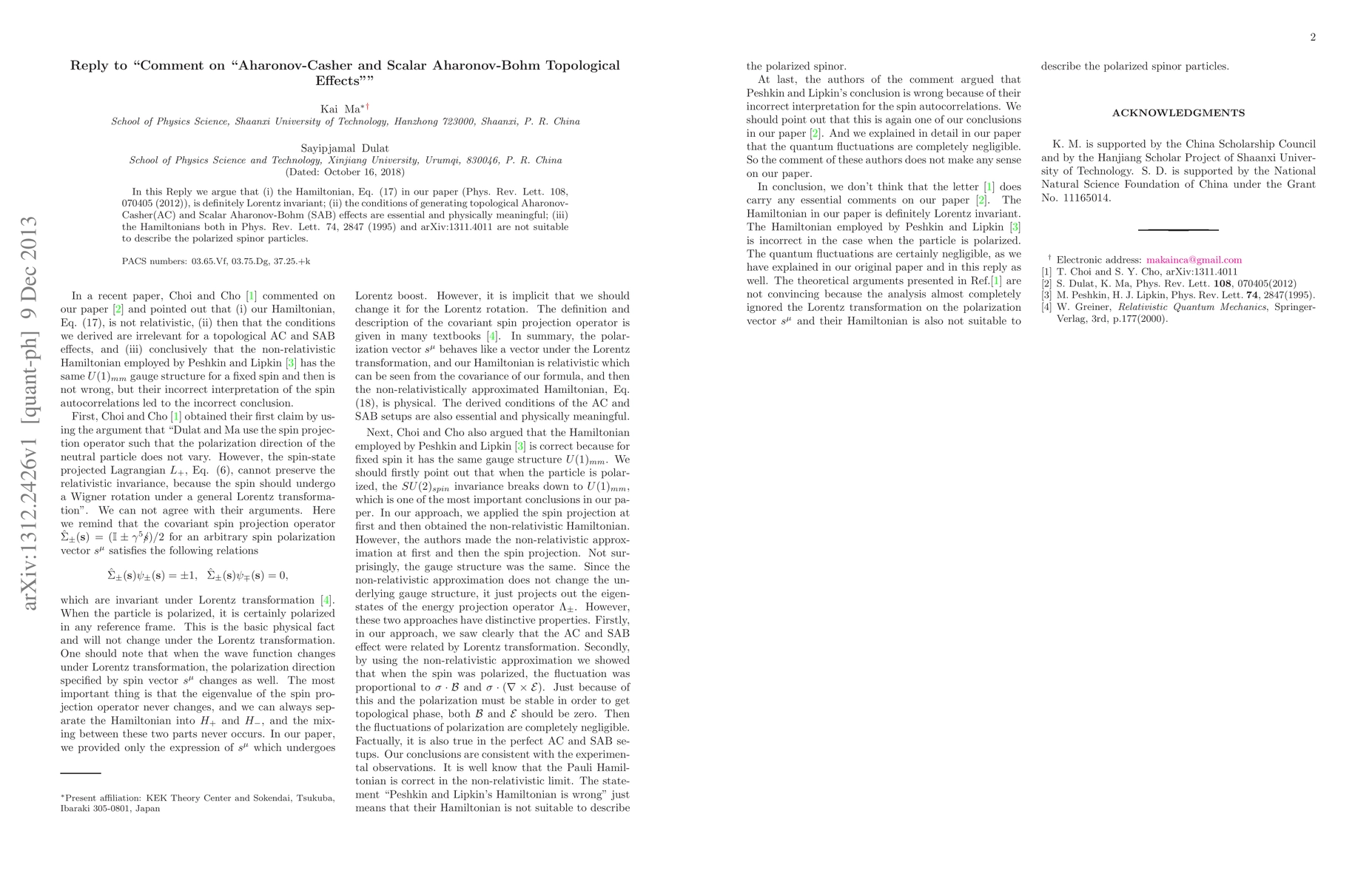 This paper defends the Lorentz invariance of a specific Hamiltonian from an earlier work and emphasizes the significance of conditions for generating topological Aharonov-Casher and Scalar Aharonov-Bohm effects, while arguing that alternative Hamiltonians are unsuitable for polarized spinor particles.