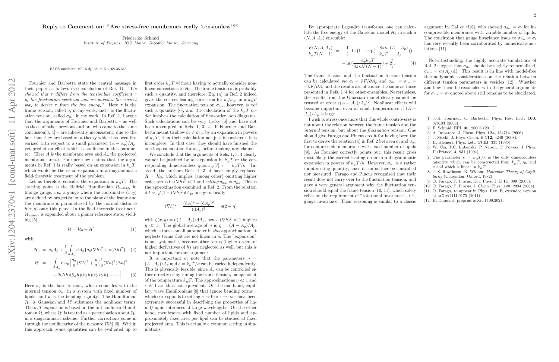 This is a reply to a comment on the paper arXiv:1204.2075 "Are stress-free membranes really tensionless ?" (EPL 95,28008 (2011)).