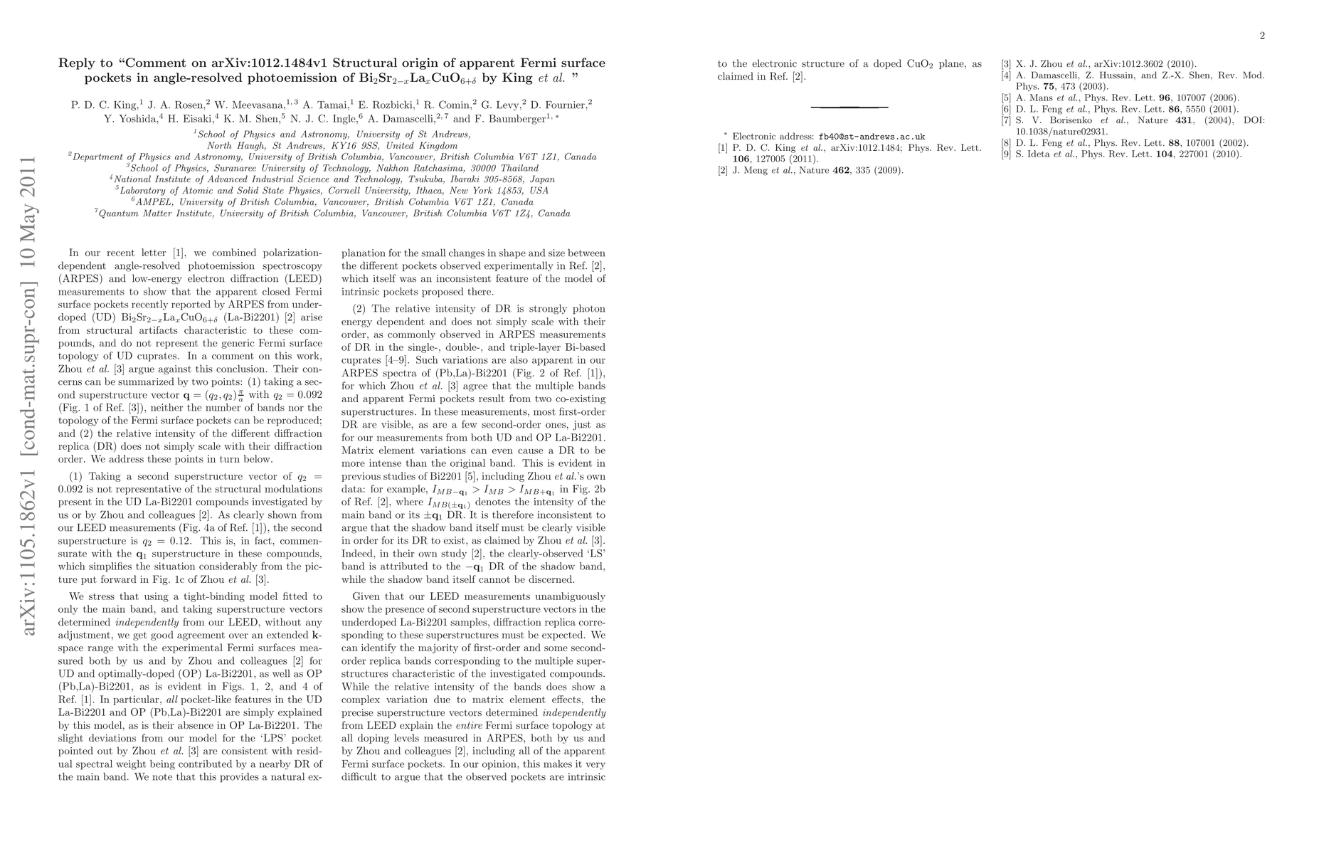 This paper addresses and refutes a critique by Zhou et al. regarding the structural origins of observed Fermi surface pockets in angle-resolved photoemission studies of Bi_2Sr_{2-x}La_xCuO_{6+\delta}. The authors reaffirm their conclusions and provide additional evidence to support their findings.