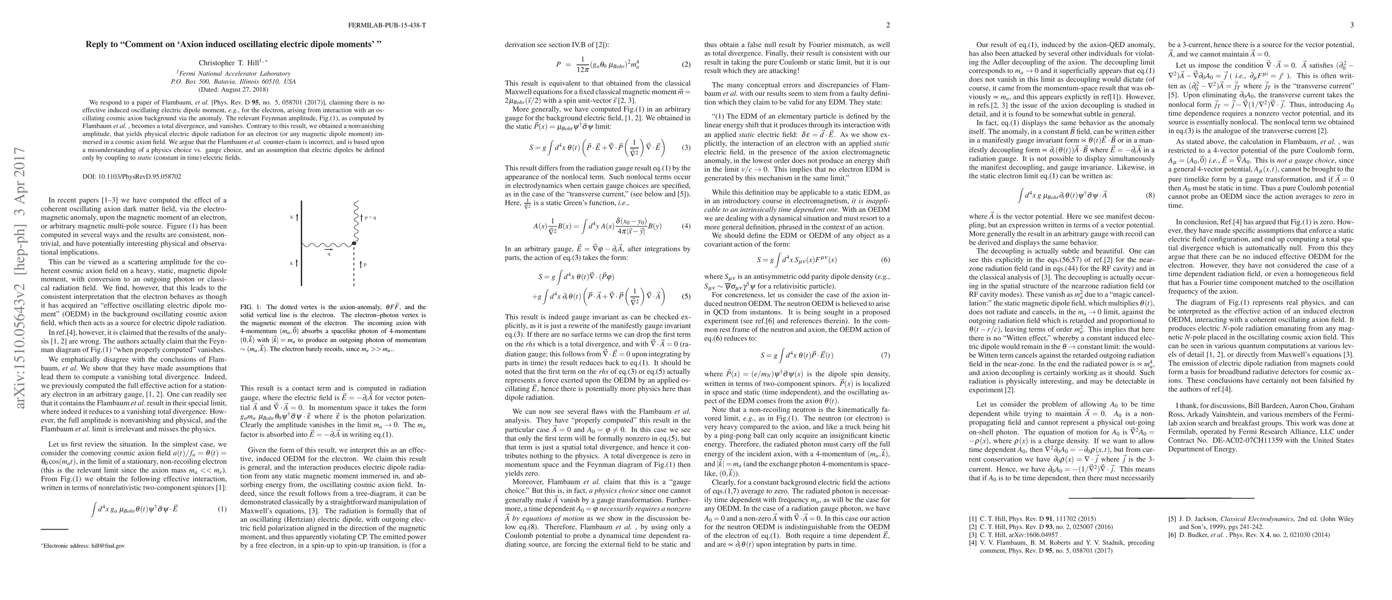 We respond to a paper of Flambaum, et.al. [Phys. Rev. D95, no. 5, 058701 (2017)], claiming there is no effective induced oscillating electric dipole moment, e.g., for the electron, arising from interaction with an oscillating cosmic axion background via the anomaly. The relevant Feynman amplitude, Fig.(1), as computed by Flambaum et.al., becomes a total divergence, and vanishes. Contrary to this result, we obtained a nonvanishing amplitude, that yields physical electric dipole radiation for an electron (or any magnetic dipole moment) immersed in a cosmic axion field. We argue that the Flambaum et.al. counter-claim is incorrect, and is based upon a misunderstanding of a physics choice vs. gauge choice, and an assumption that electric dipoles be defined only by coupling to static (constant in time) electric fields.