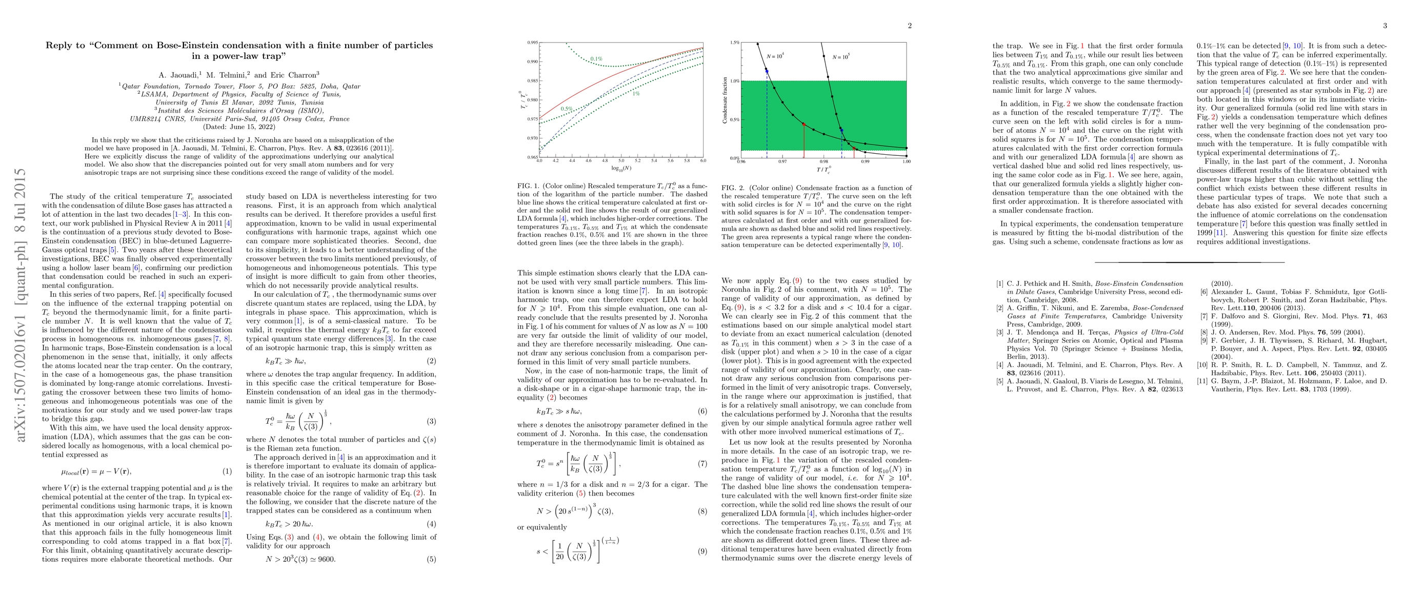 In this reply we show that the criticisms raised by J. Noronha are based on a misapplication of the model we have proposed in [A. Jaouadi, M. Telmini, E. Charron, Phys. Rev. A 83, 023616 (2011)]. Here we explicitly discuss the range of validity of the approximations underlying our analytical model. We also show that the discrepancies pointed out for very small atom numbers and for very anisotropic traps are not surprising since these conditions exceed the range of validity of the model.